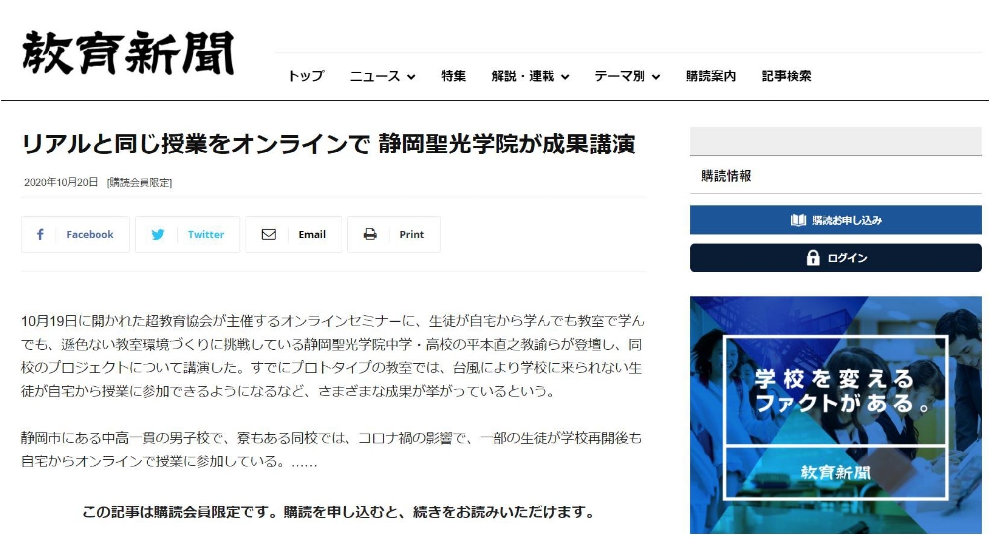 10月19日(月) 超教育協会主催のオンラインセミナーにて未来の教室について平本教諭・中村教諭が講演を行いました。教育新聞様に記事にしていただいております。(有料記事ですので冒頭のみ公開です)シンポジウムでは後半、かなり活発な質疑応答が行われていて、未来の教室への関心の高さをあらためて感じることができました。引き続きプロトタイプ教室のブラッシュアップをすすめてまいります。