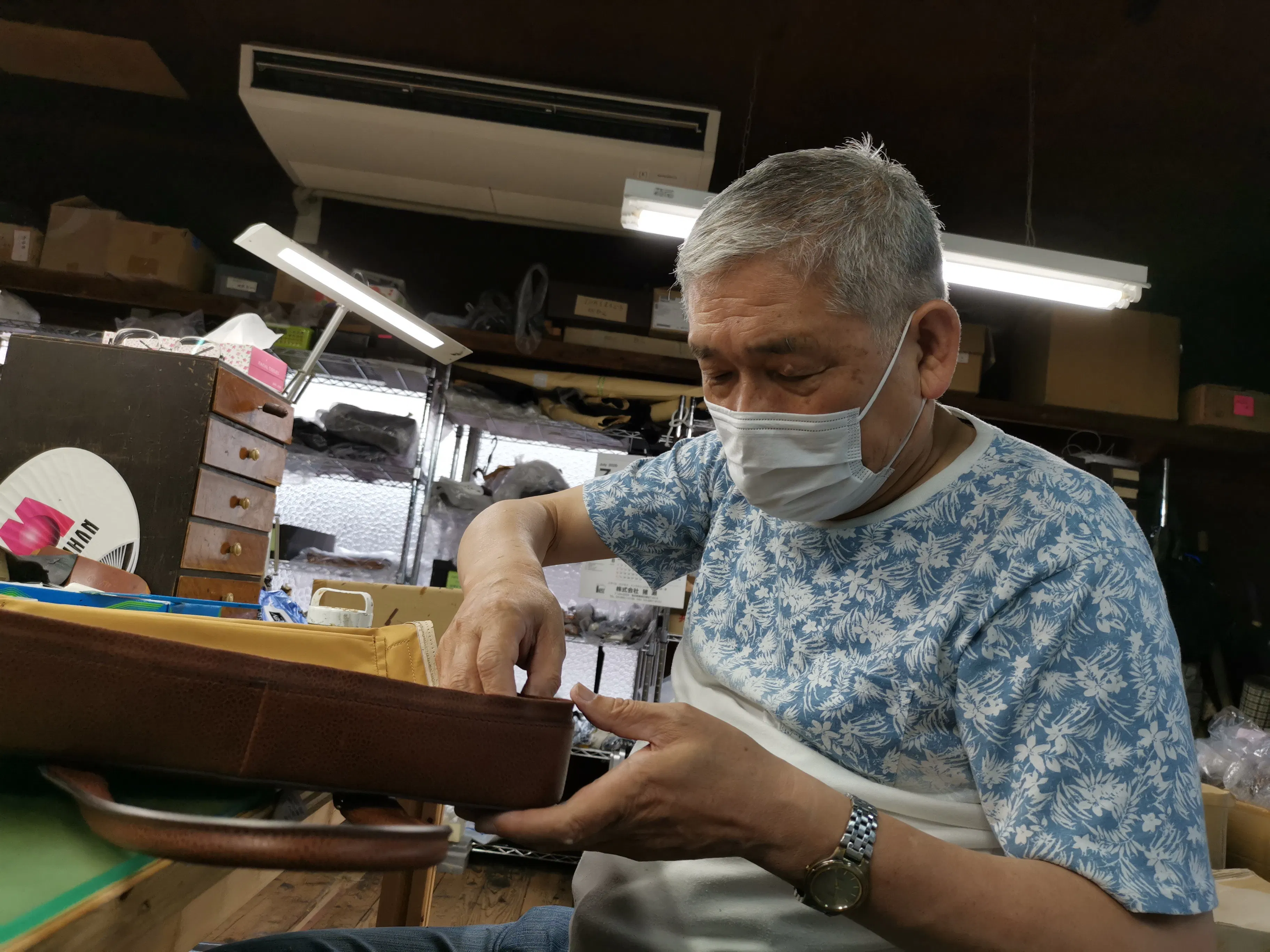 ▲さて、今日の写真はこの道55年の革小物職人・福田さん。今日は鞄をお作りになってますね。