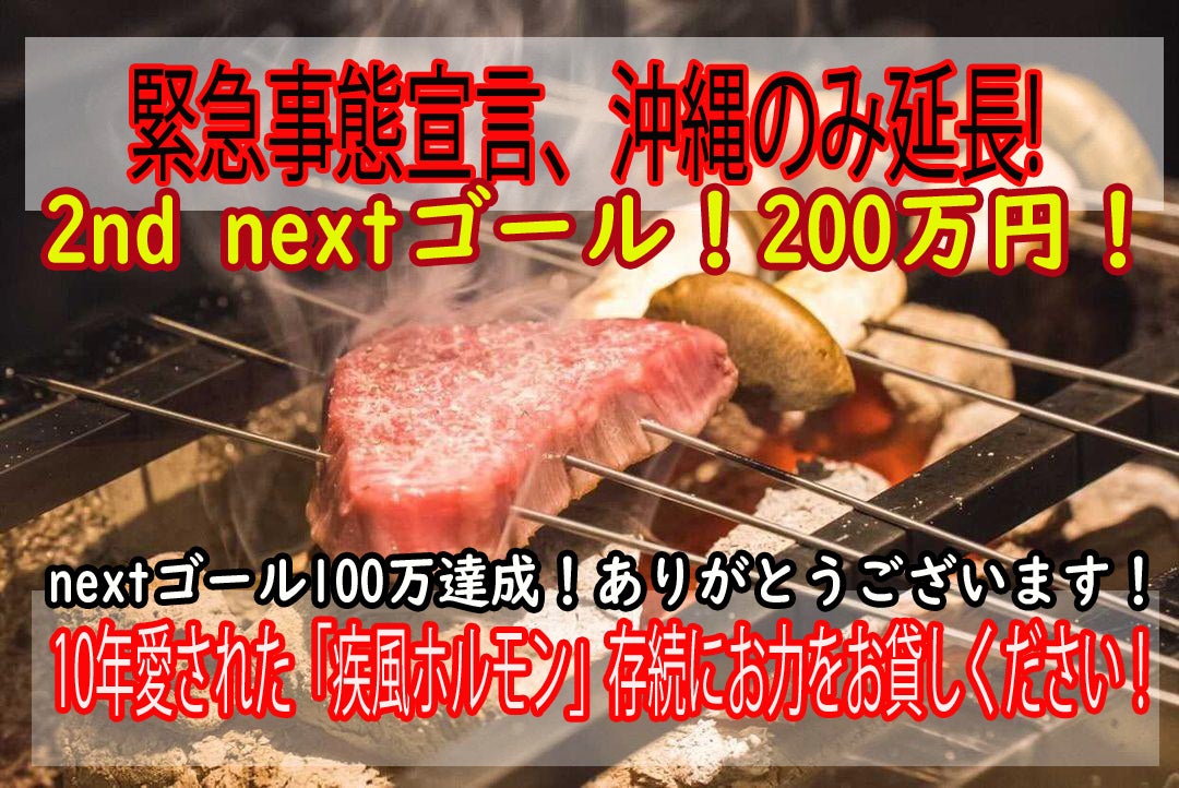 目標50万円をはるかに超える170万円、340%突破!クラウドファンディングをやり始めた当初はここまで集まるものだと思ってもいませんでした。沢山の支援もそうですが、色々な方面から声をかけてもらったり、応援してくれたりと、「疾風ホルモンは皆様のためにあるんだ!」っと改めて、その存在意義を強く感じましたまた、尽力してくれたスタッフと、つないでくれた様々な人と人…本当に本当に感謝しかありません。ありがとうございます。しかし、沖縄の状況は正直よくありません。連日、100人を超えるコロナ感染者、25日は200人を超えていました。本日27日には300人を超える感染者・・・これは10万人での割合だと東京より悪い結果となります。緊急事態宣言も8月22日まで延長となってしまいました。沖縄ではオンシーズンの8月が壊滅状態なのは本当に苦しいのですが、それよりも恐ろしいのが、果たして8月22日以降に解除されるのかどうか…?今から不安で仕方ありません。毎日、沢山のお電話を頂きます。「8時以降もやっていますか?」「お酒出してますか?」もちろん、お断りするのですが、もし開けていれば何度、満席にできたかわかりません。電話先でお断りすることで毎回、毎回、気力が削れる思いです。悔しいです。今のうちにご報告しておきます。正直、この状況が半年続けば、持ちこたえる自信はございません。それでも来ていただけるお客様やテイクアウトしてくださる方もいて、大変、励みになります。「頑張って!」「潰れないで!」「クラウドファンディング支援したよ!」のお声かけさらには直接、お店に現金を持ってきて支援してくれる方々も一人二人ではございません。私は本当に本当に素晴らしいお客様とスタッフに恵まれてる…本当に運がいいなっと感慨深い思いであります。クラウドファンディングは締め切られる一秒前まで最後まで声をあげていきたいと思います!スタッフもSNSなど様々なところで告知してくれたり、知り合いの宣伝してくれたりと2nextゴールの200万円を目指して、働きかけてくれています!そんな姿を見せられては自分がファンディングポーズを下す訳にはいきません!こんな弱小焼肉店が170万(+直接の支援)集まった事ですでに奇跡と言えます。でも、奇跡の先を僕は見たい!頑張ったスタッフに見せてあげたい!これってワガママでしょうか?僕はお願いするしかできないのが、なんとも情けないではあるのですが、どうかどうか、ご協力をよろしくお願いいたします!勝ちましょう!コロナに!後木俊介