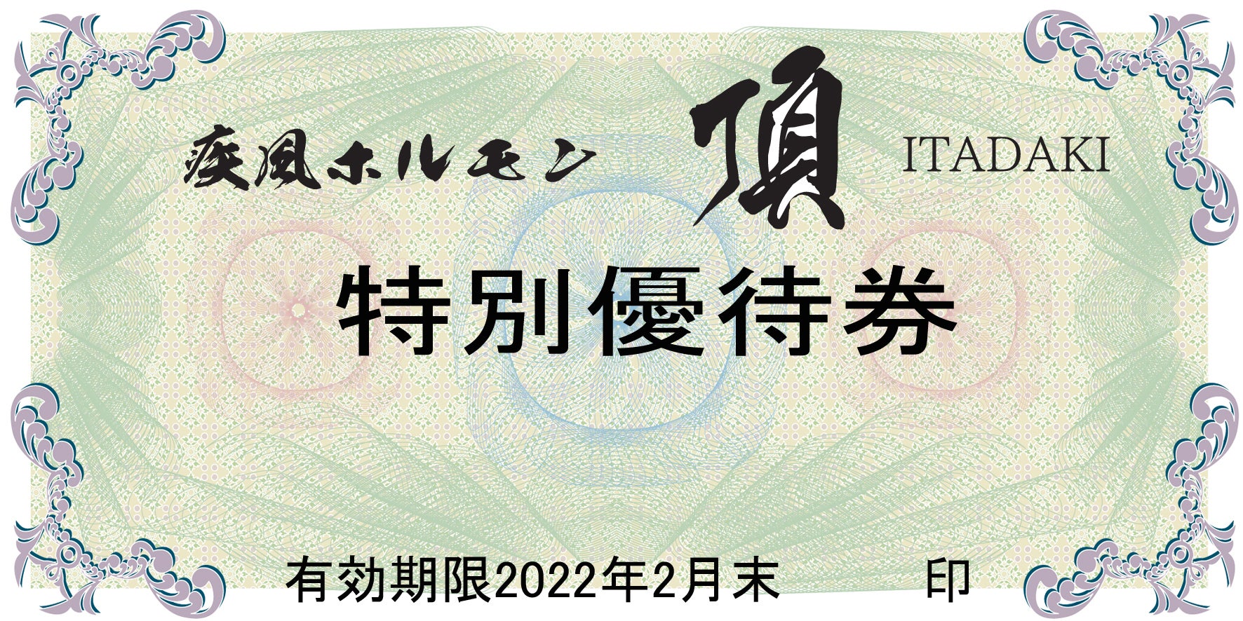 「疾風ホルモン頂」による、お一人様20000円(税・サ込) ×5名様のCAMPFIRE限定特別コース。5名様料金になりますので、ご予約は5名様でお願いします。人数が減った際、返金などには対応しかねます。ご予約は先約優先となりますので、お早目にご予約お願いします。お飲み物は別料金となります。チケットは郵便にてお送りいたします。