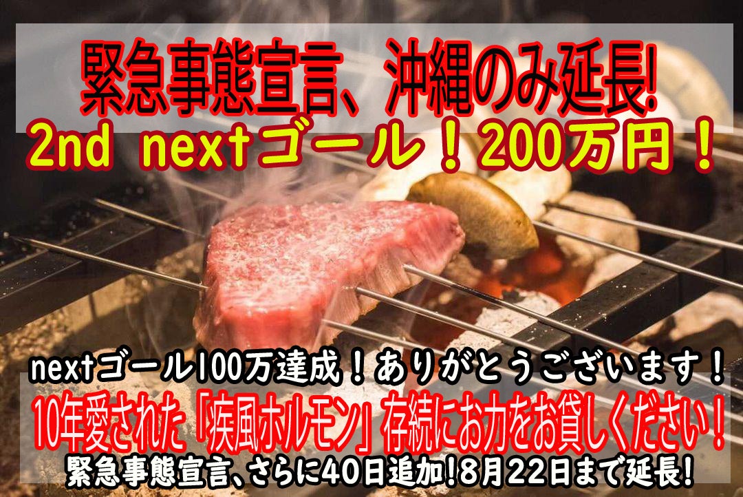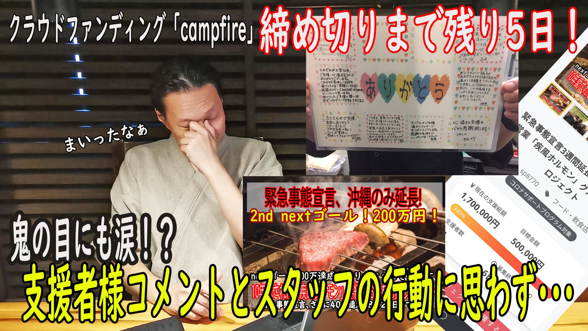 目標50万円をはるかに超える170万円、340%突破!クラウドファンディングをやり始めた当初はここまで集まるものだと思ってもいませんでした。沢山の支援もそうですが、色々な方面から声をかけてもらったり、応援してくれたりと、「疾風ホルモンは皆様のためにあるんだ!」っと改めて、その存在意義を強く感じましたまた、尽力してくれたスタッフと、つないでくれた様々な人と人…本当に本当に感謝しかありません。ありがとうございます。しかし、沖縄の状況は正直よくありません。連日、100人を超えるコロナ感染者、25日は200人を超えていました。本日27日には300人を超える感染者・・・これは10万人での割合だと東京より悪い結果となります。緊急事態宣言も8月22日まで延長となってしまいました。沖縄ではオンシーズンの8月が壊滅状態なのは本当に苦しいのですが、それよりも恐ろしいのが、果たして8月22日以降に解除されるのかどうか…?今から不安で仕方ありません。毎日、沢山のお電話を頂きます。「8時以降もやっていますか?」「お酒出してますか?」もちろん、お断りするのですが、もし開けていれば何度、満席にできたかわかりません。電話先でお断りすることで毎回、毎回、気力が削れる思いです。悔しいです。今のうちにご報告しておきます。正直、この状況が半年続けば、持ちこたえる自信はございません。それでも来ていただけるお客様やテイクアウトしてくださる方もいて、大変、励みになります。「頑張って!」「潰れないで!」「クラウドファンディング支援したよ!」のお声かけさらには直接、お店に現金を持ってきて支援してくれる方々も一人二人ではございません。私は本当に本当に素晴らしいお客様とスタッフに恵まれてる…本当に運がいいなっと感慨深い思いであります。クラウドファンディングは締め切られる一秒前まで最後まで声をあげていきたいと思います!スタッフもSNSなど様々なところで告知してくれたり、知り合いの宣伝してくれたりと2nextゴールの200万円を目指して、働きかけてくれています!そんな姿を見せられては自分がファンディングポーズを下す訳にはいきません!こんな弱小焼肉店が170万(+直接の支援)集まった事ですでに奇跡と言えます。でも、奇跡の先を僕は見たい!頑張ったスタッフに見せてあげたい!これってワガママでしょうか?僕はお願いするしかできないのが、なんとも情けないではあるのですが、どうかどうか、ご協力をよろしくお願いいたします!勝ちましょう!コロナに!後木俊介 もっと見る