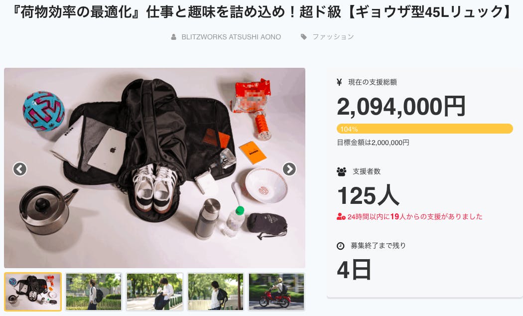 本日、CAMPFIREプロジェクト第6弾【ギョウザ型45Lリュック】は目標金額200万円をクリアー致しました!