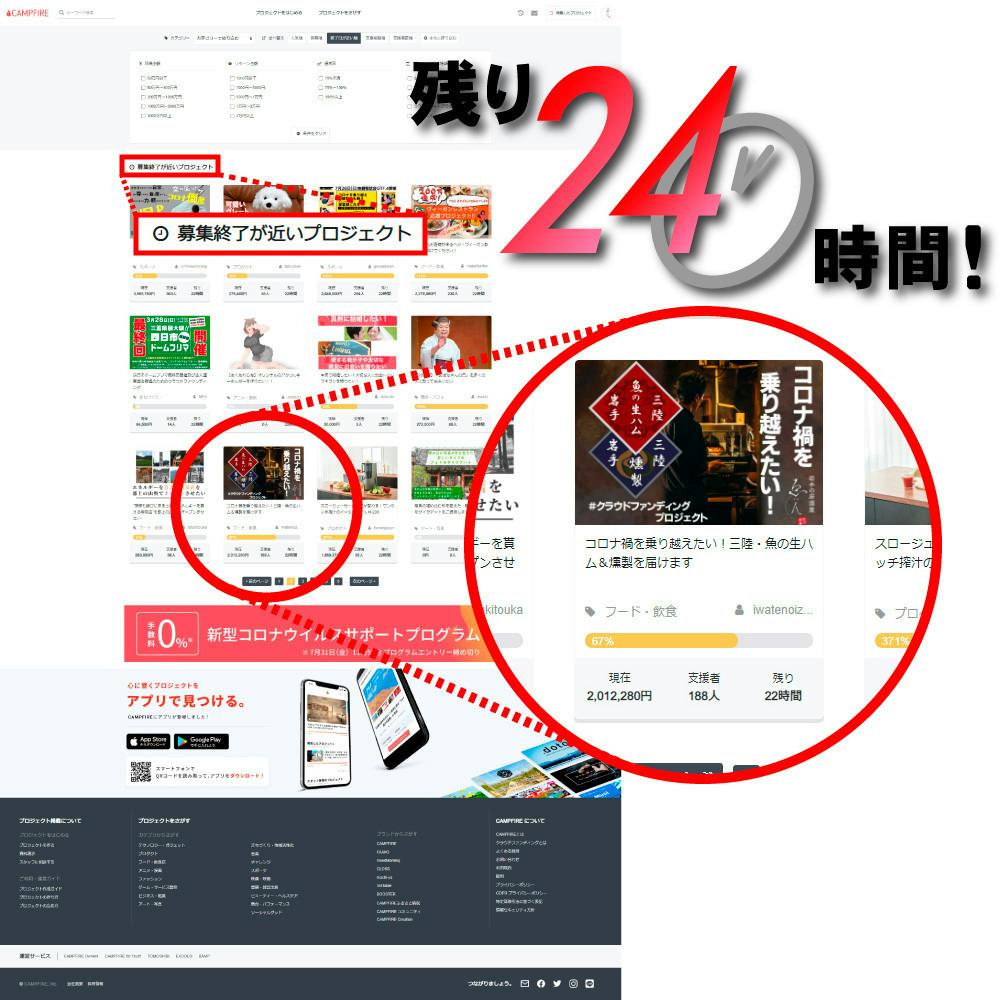 2020/07/26 01:53【支援金額200万円突破!あと24時間!】スタートから今まで、多くの方にご支援いただいてきたプロジェクトも残り24時間となりました!おかげさまで支援金額は200万円を突破し、ラストスパートに怒濤の勢いで支援が集まっています!サクセスまであと一歩、あと一歩です!東日本大震災で大きな被害を受け、さらにこの度の新型コロナウイルス感染症による影響を受けた三陸・岩手の「食」を救うためにも、皆様のご協力をよろしくお願いします!!また、SNSでの拡散にもご協力いただければ幸いです。よろしくお願いします!! もっと見る7月26日23:59まで