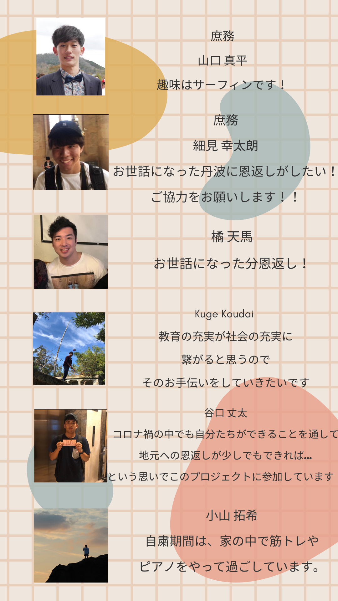 2020/06/23 01:19プロジェクト広報班の橘天馬(たちばなてんま)です!ぼくは丹波に生まれ、丹波に育ちました。しかし、高校から丹波を離れ寮生活を送り大学も奈良、今では東京で働いています。このプロジェクトに参加するとき正直迷いました。できることはあるのかなと…でも、そんな迷いはすぐになくなりました。何故か、私がたどり着いた答えは、『恩返し』。間違いなく私のルーツは丹波で、自然に溢れた土地、暖かい人々、美味しい食べ物。何より、受けてきた教育。とくに、丹波市国際交流協会の皆さん。たくさんの機会をも与えていただきました。色んな人達の協力と助けがあって、大きくなってきました。人生の半分以上を丹波の人々に育てられた、僕達だからこそ出来ることがあるはず、愛する故郷をもっと良いものにしていきたいそんなメンバーがここにはいます!教育で言うと、ほとんどの人が何不自由なく受けてきました。でも、今は当たり前が、当たり前じゃなくなり。環境すらもない。悲しいではありませんか?未来はもっと明るいはずです、そして丹波、兵庫、日本を担う人間が必要です。こんな、ところで教育格差が生まれ、ふるさとが悲しくなるのは耐えられません!東京いや日本中にこの活動が広まれば、ただの『恩返し』に終わらず、ほんとに日本がもっと良くなると信じてます。まずは丹波からそのファーストステップを踏み出しましょう!長々と失礼いたしました! もっと見る
