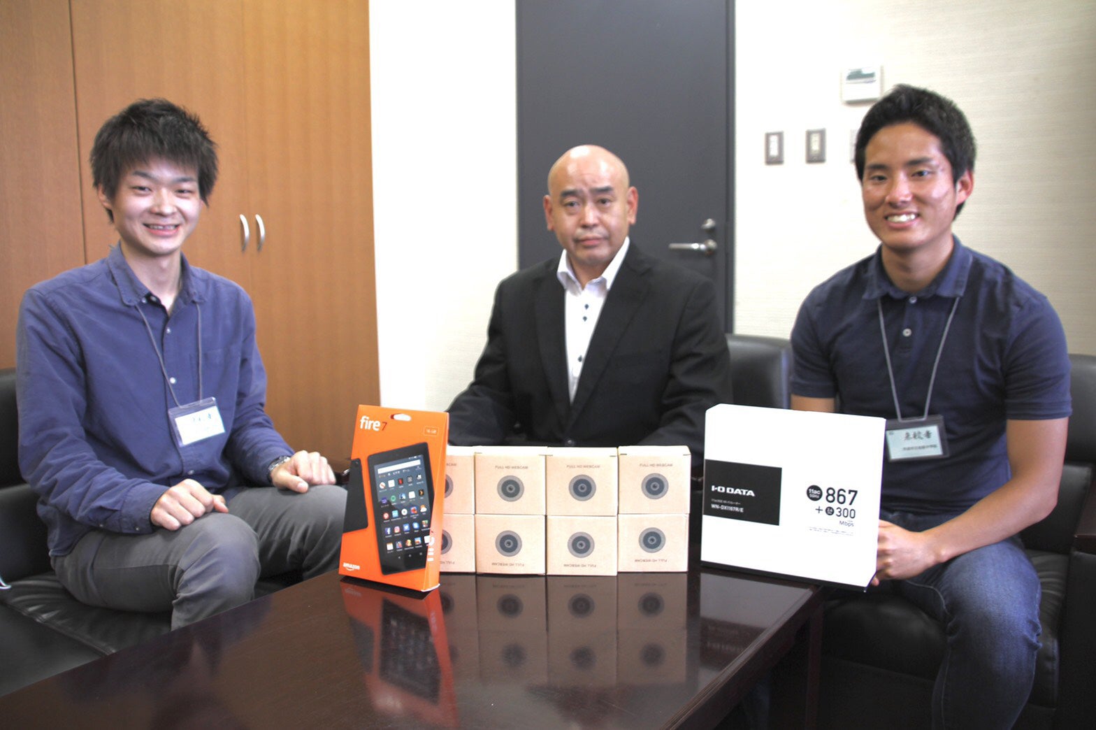 →当中学校の校長にICT機器を寄贈する藪下代表(左)と、広報担当の小西くん(右)