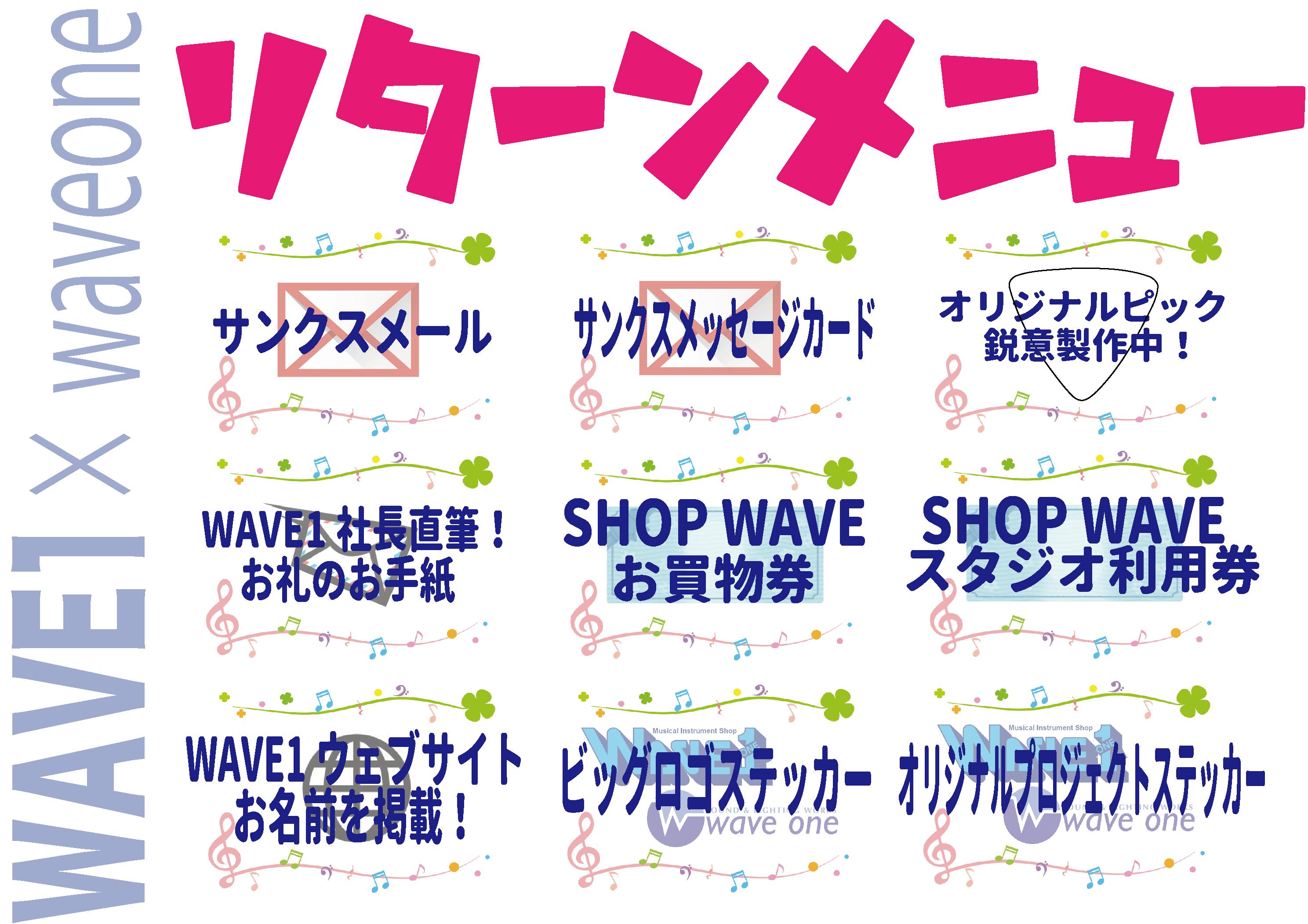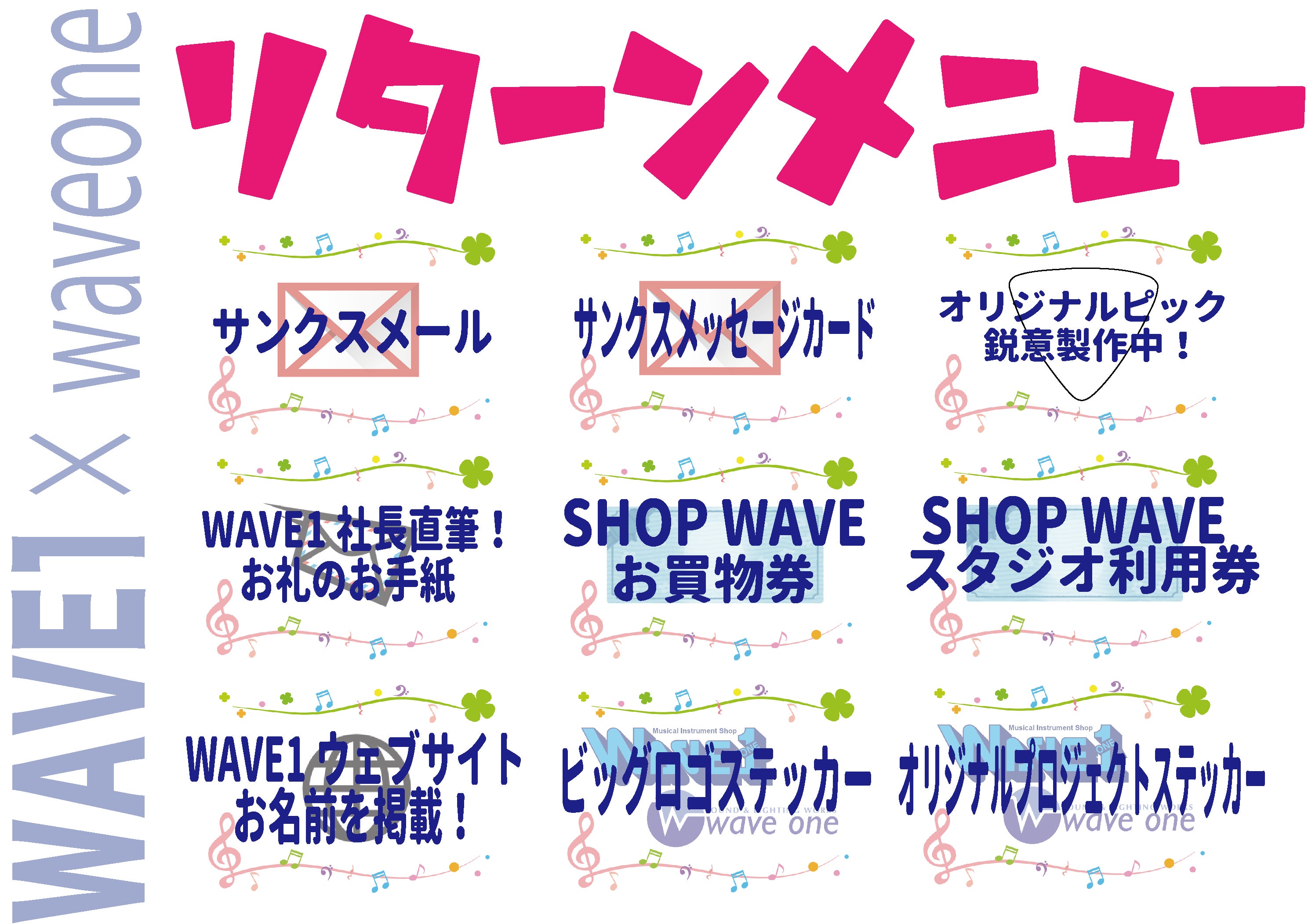 はじめてクラウドファンディングに取り組むにあたり、頂戴したご支援に対し何をお返しすることが皆様から喜んでいただけるか検討を重ねました。今回のプロジェクトでは楽器店WAVE1をご利用いただくことを返礼品の中心とするご支援によって、弊社全体をご支援いただくことにいたしました。