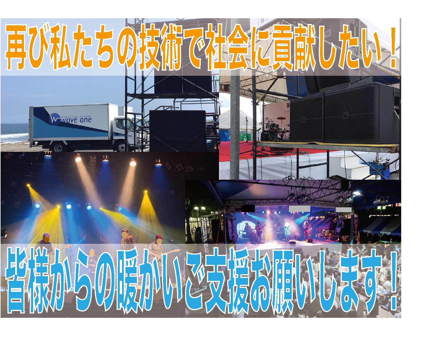 直近の有限会社ウェーブワンの業績のうち65%以上が音響照明事業部の売上であり、今年度業績についても大幅減となることが決定的となっています。稼働している店舗事業のさらなる努力により少しでも業績向上を目指すのは当然のことですが、実際にはその業績をもって音響照明事業部を含めた会社全体の雇用をカバーしていくことはとても難しい状況です。会社経営陣としては各種支援策を最大限活用しながら会社全体の事業、雇用の継続に向け全力で取り組んでおりますが、短期的な資金繰りから非常に厳しく綱渡りの状態が続いております。