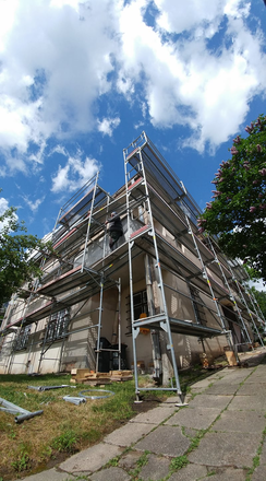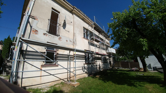 修繕工事は、古くなった屋根の撤去工事から着手しました。そして、9月に我々Tokon-Internationalが担当する外壁の塗り替え工事がよりスムーズに進められるために、カウナス市の監督のもとで、各種の下準備やその他の修繕も同時に進行しています。上記の画像は、足場内側の様子です。 情報元:Sugihara House・公式ホームページ:http://www.sugiharahouse.com/・フェイスブックページ:https://www.facebook.com/sugiharahouse/