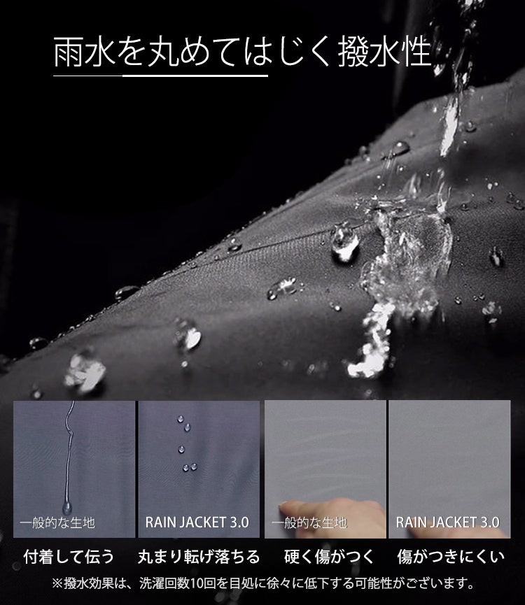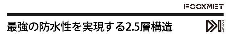 斬新な2.5層の防水加工で、驚異の撥水性による防雨、雨の日特有のベタつき・不快感を解消するだけでなく、抜群の防風性もそなわり冷風による体温の低下防止にも効果的。