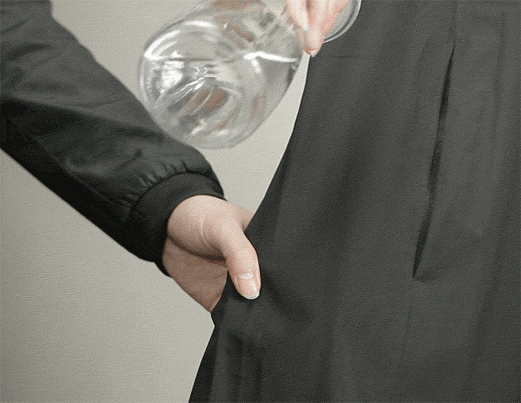 ▲驚異の撥水性で、雨水を生地に付着させません。あっという間に生地が乾くのでベタベタせずに快適!
