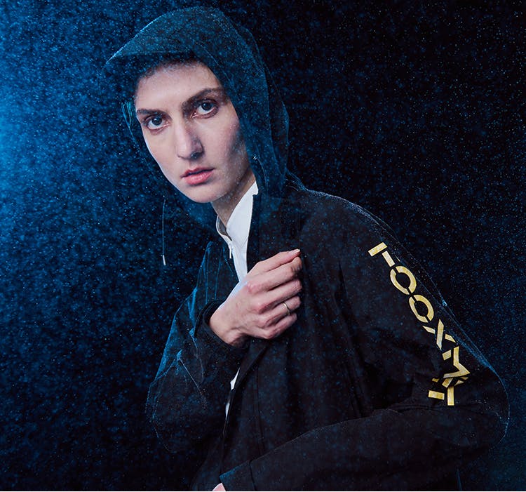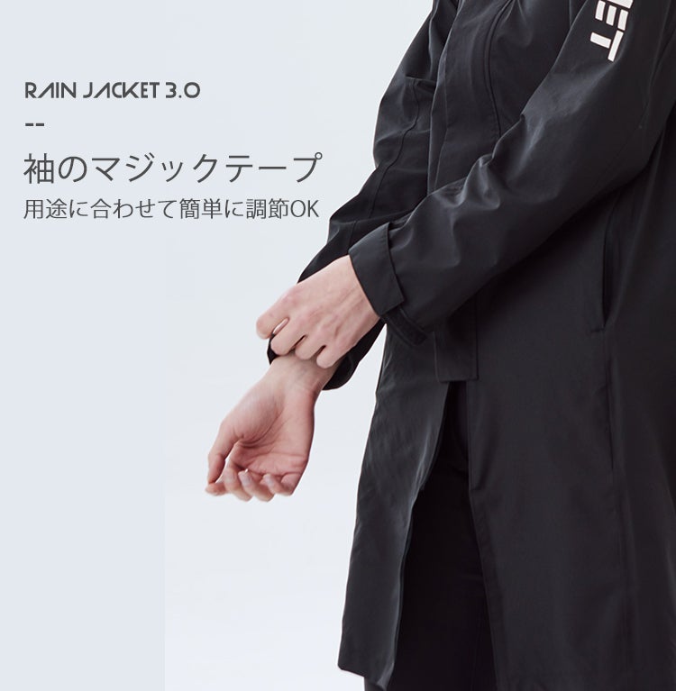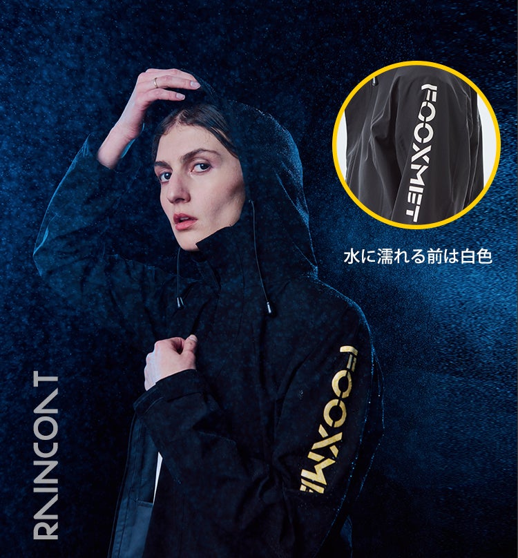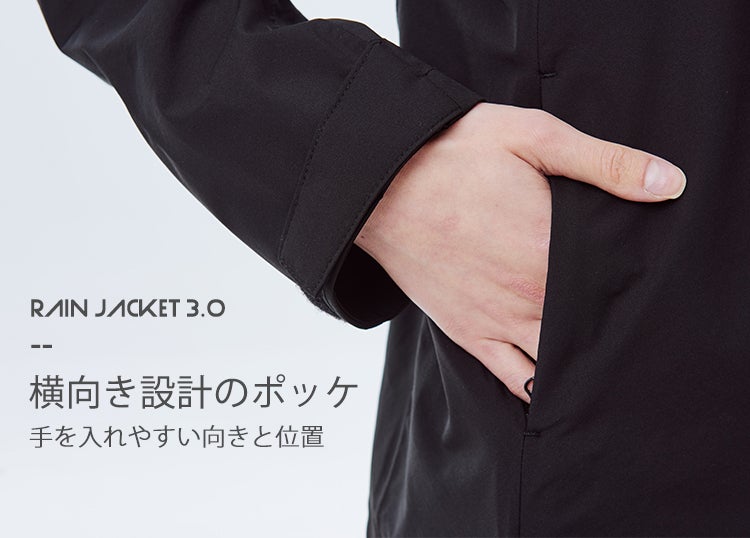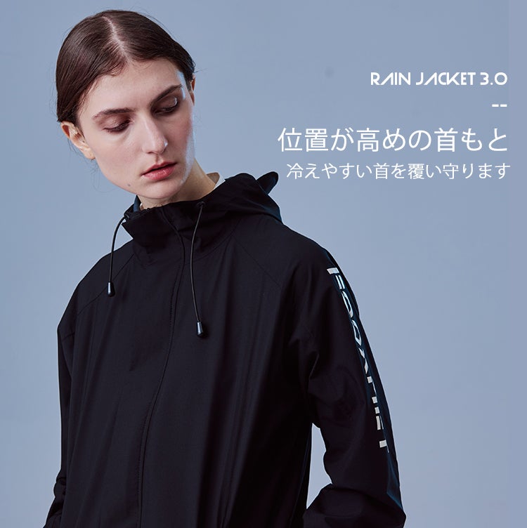 「RAIN JACKET 3.0」は、DWR加工を施した防水性・防風性に優れた生地、14,000mmの耐圧性を誇る防水TPUフィルム、変色デザインを実現させた極薄の膜の2.5層構造。長時間の大雨にも耐えることができる丈夫さを持ちながら、とっても軽く、普段着としても着用できるスタイリッシュさ。