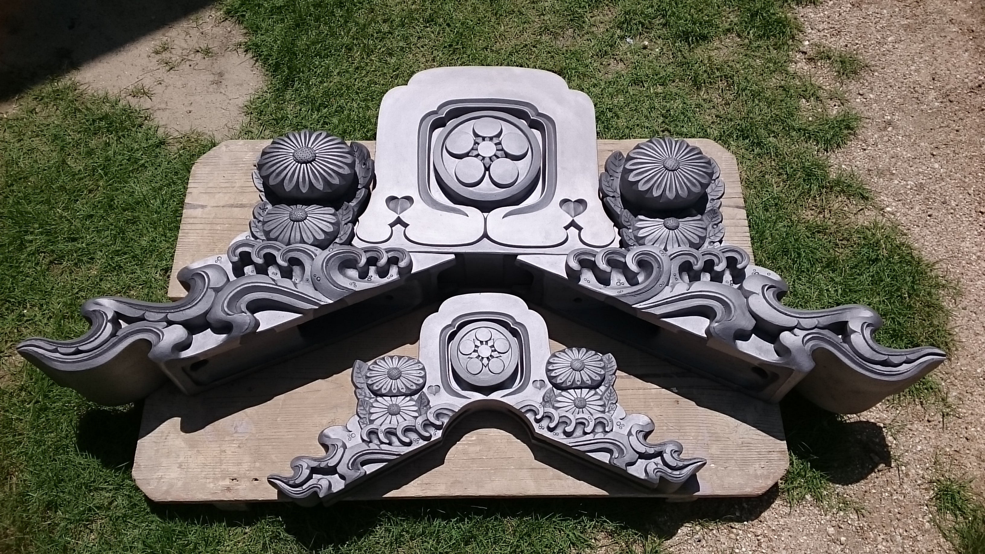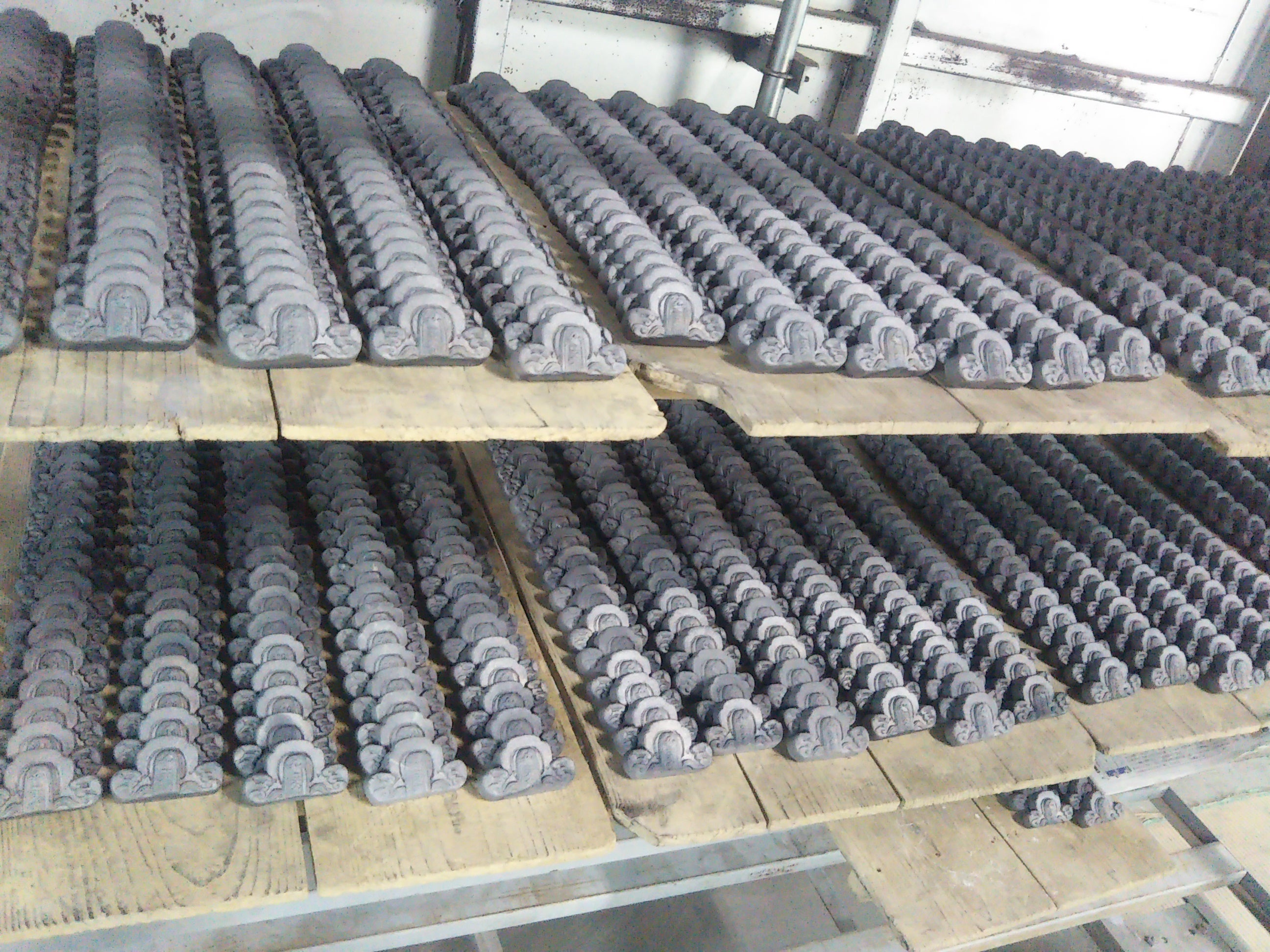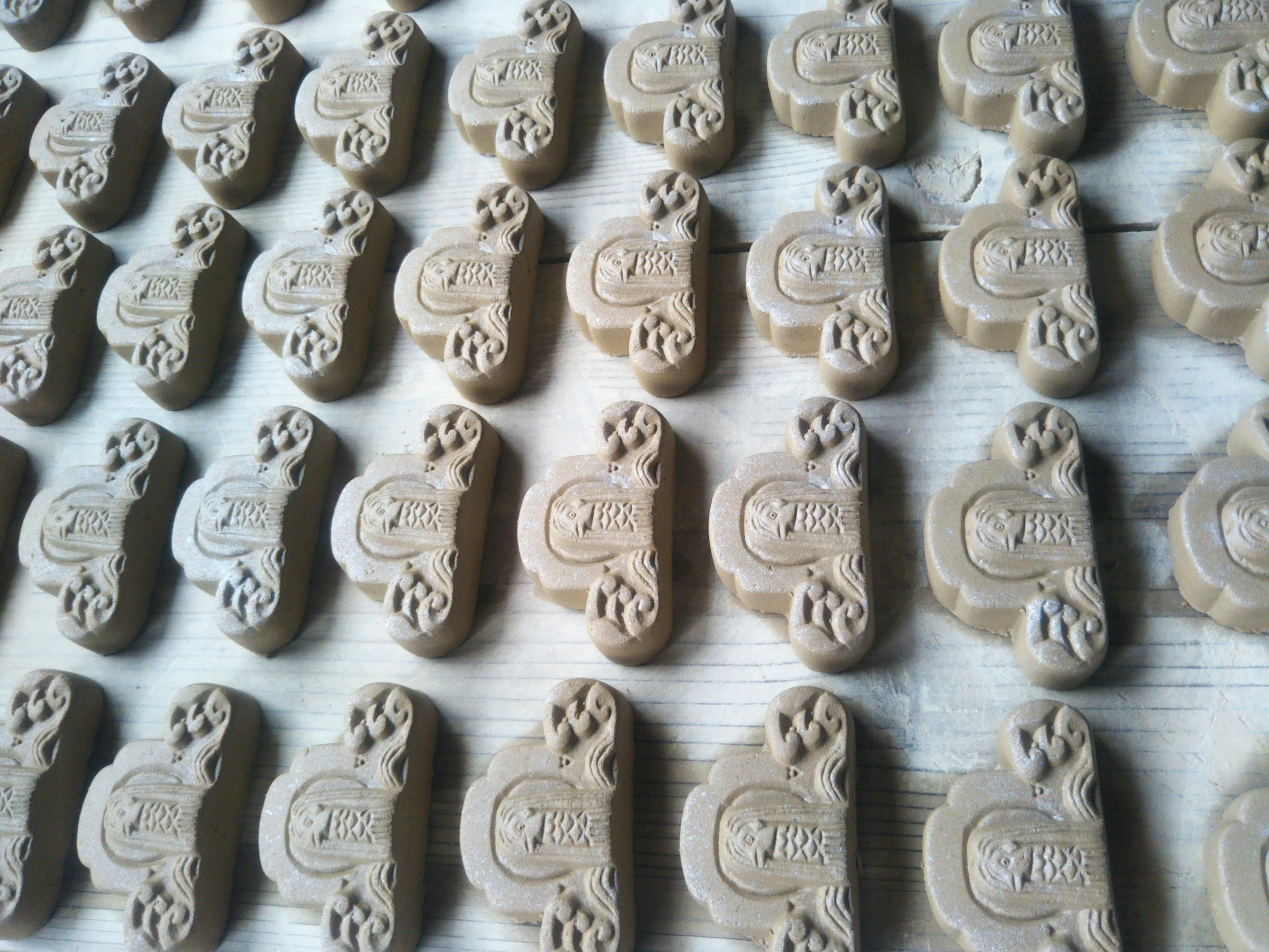 また、3,000個以上は当工房の生産能力を超えるため、資金の集まり具合に応じて製造方法を変更する場合があります。具体的には、金型を作成してプレス成型によって成形します(屋根材の瓦や鬼瓦も、量産が見込める場合はこの製造方法をとっています)。この場合、鬼福製鬼瓦所が企画と製品デザインと最終責任を負い、製造は三州瓦を量産している瓦メーカーに委託します。