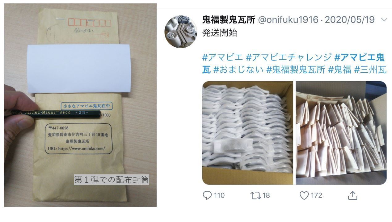 鬼福製鬼瓦所は小さな事業所ですが1,000 個までなら当方負担でなんとかできると考え、1,000個限定で第1弾を行いました。2020年5月12日に鬼福製鬼瓦所のホームページとSNSで欲しい方を募ったところ、Twitterの自然拡散により2日で希望者が上限数に到達する大きな反響を頂きました( #アマビエ鬼瓦 )。お申込み頂いたすべての方への発送を2020年5月22日に終えましたが、締め切り後も「有料でも良いから購入したい」「どこで購入できますか?」とのお問い合わせが続きました。