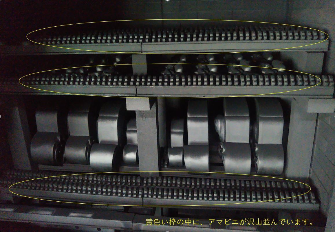 (窯の中で整然と並ぶアマビエ鬼瓦(1120℃で焼成後)