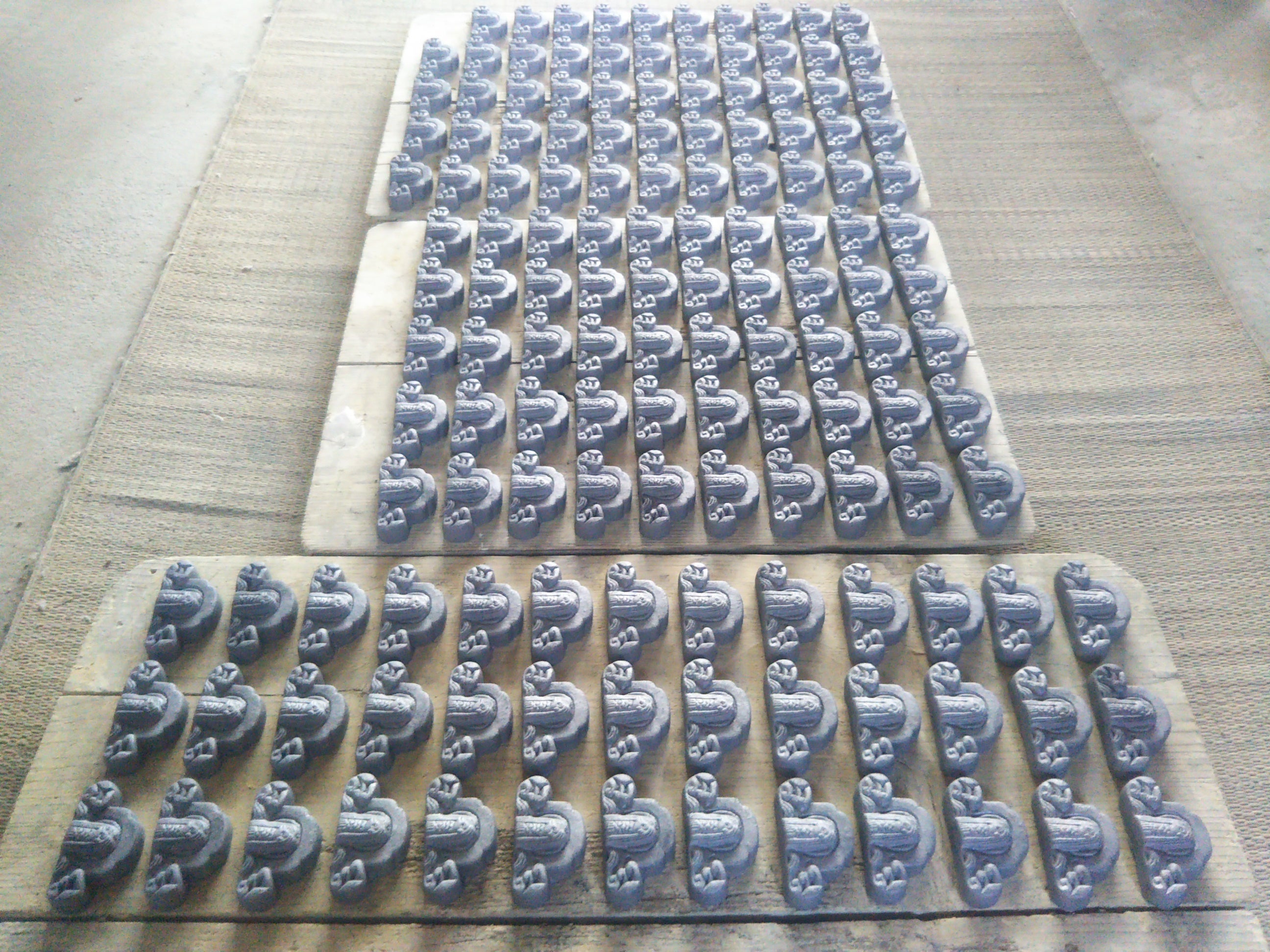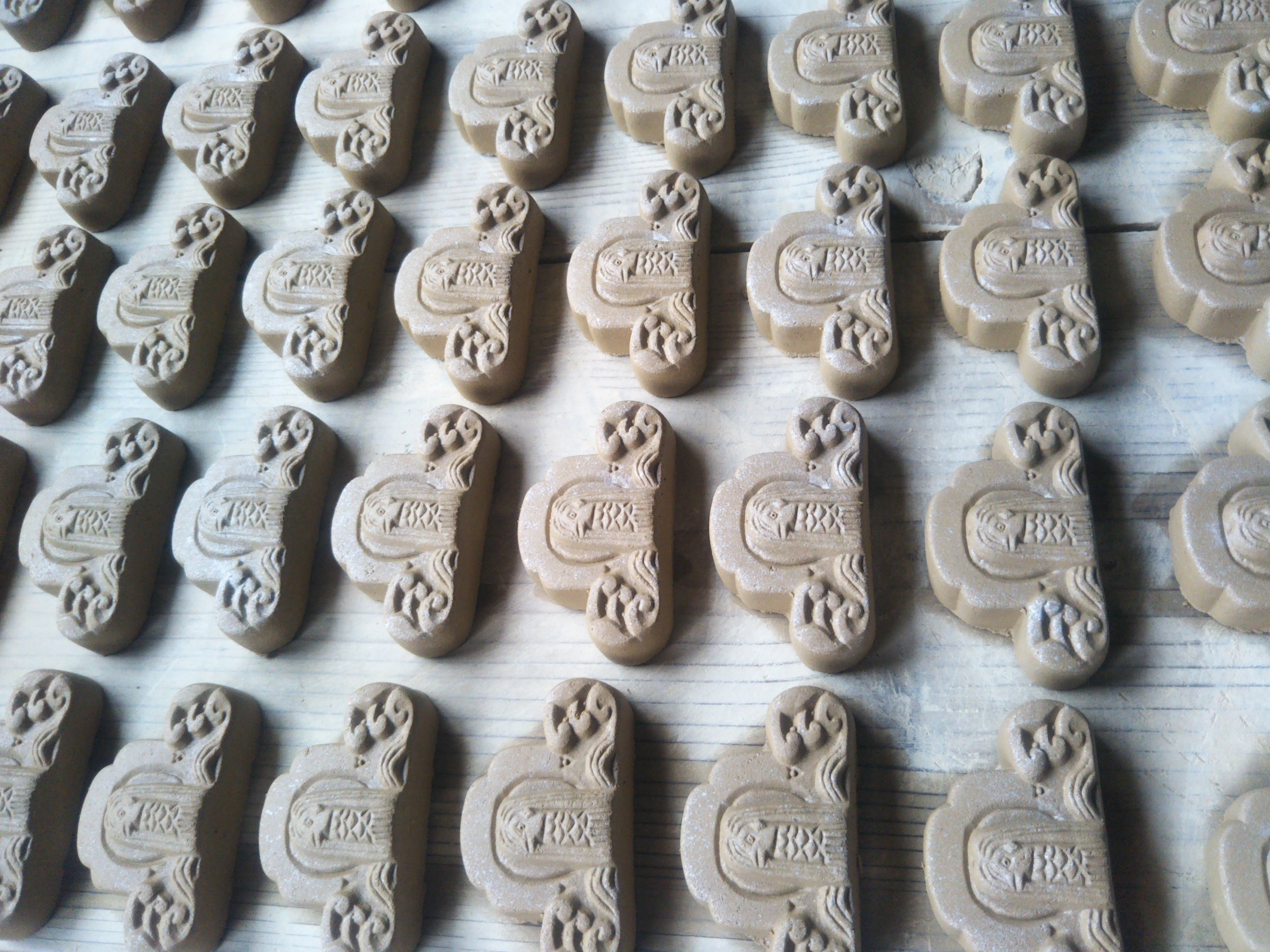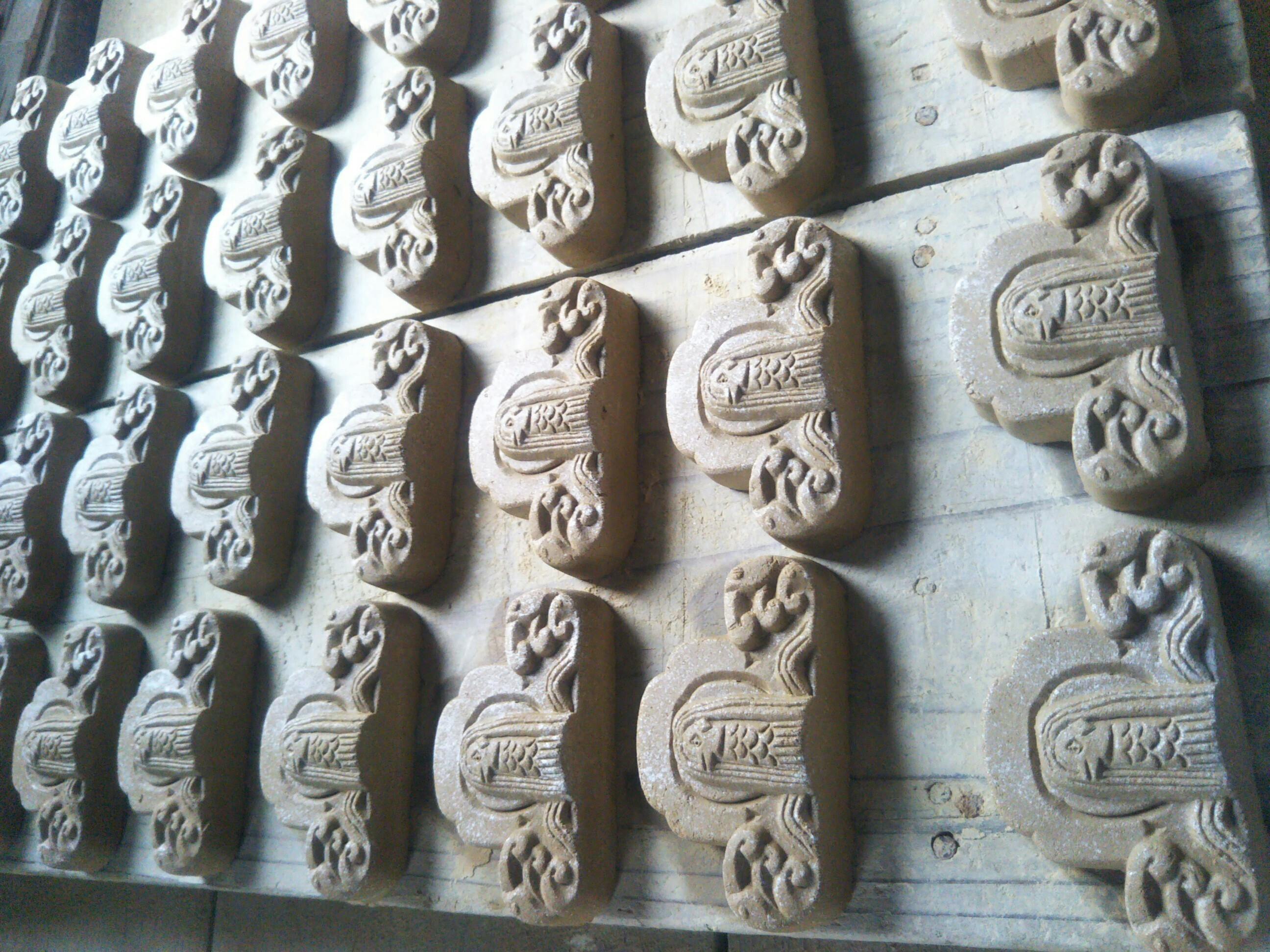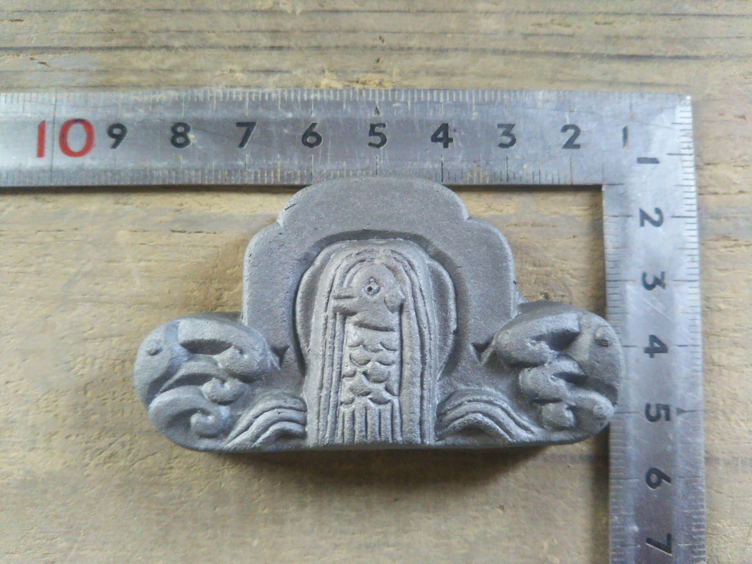 また、3,000個以上は当工房の生産能力を超えるため、資金の集まり具合に応じて製造方法を変更する場合があります。具体的には、金型を作成してプレス成型によって成形します(屋根材の瓦や鬼瓦も、量産が見込める場合はこの製造方法をとっています)。この場合、鬼福製鬼瓦所が企画と製品デザインと最終責任を負い、製造は三州瓦を量産している瓦メーカーに委託します。