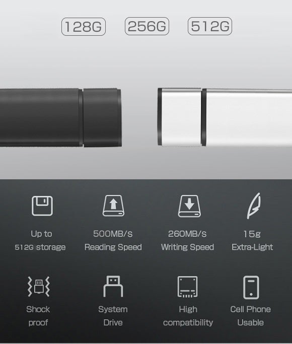 FlashGetは最大読み込み速度500MB/s以上、最大書き込み速度260MB/s以上の高速データ転送を実現するモデルです。