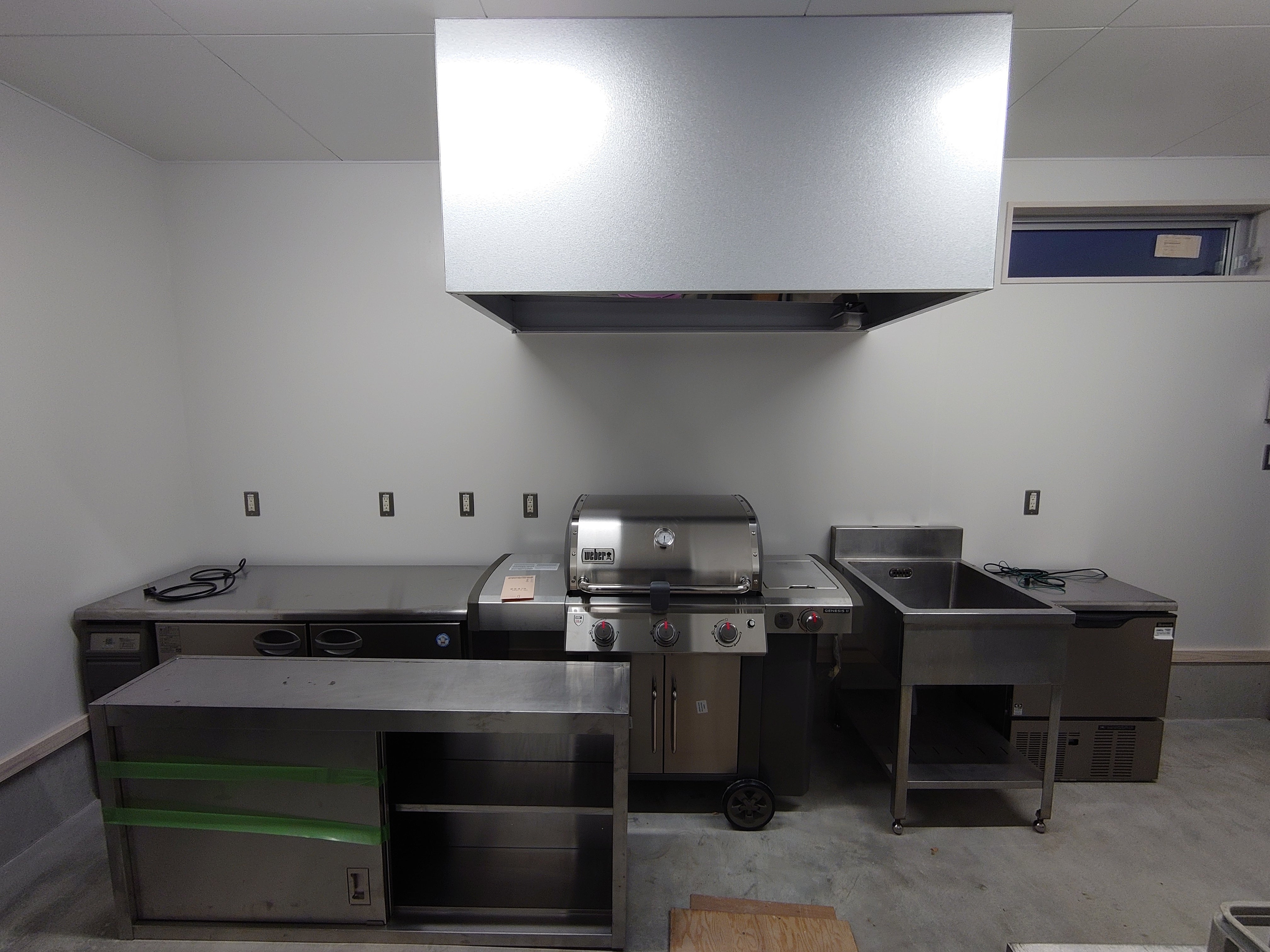備前ベースキャンプの建物は、入口手前にキャンピングトレーラー展示場、そして事務・管理棟兼売り場があり、その奥にはスタッフ用の調理室、そして軒下野外シンクとなります。その調理室に、調理器具の搬入が始まりました。器具はもちろん飲食店さんと同じ、飲食店普通形態の器具。全てを新品ではかなり高額になりますので、中古器具を扱う業者さんとの打合せで揃えました。RVパークでBBQが安心してできるよう、肉の保管や野菜の提供、調理が必要となれば、飲食店と同様の調理室を完備しないといけません。搬入はシンク、冷凍冷蔵庫、台下冷蔵庫、食器洗浄機、テーブル、ガスグリル、製氷機など。備前ベースキャンプのガスコンロは、一般のガスコンロとちがい、アメリカBBQで有名なウェーバーのガスグリル「ジェネシス」を導入しました。フード下にあるのがそうです。業者さんや私も、「ジェネシス」の組立は初めてでしたので、かなり時間がかかりましたが、完成しました。建物の仕様も徐々にお伝えしていきますね!