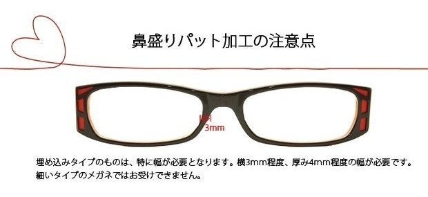 鼻盛り加工の取り付けは一般的なアセテート、セルロイド素材のフレーム、TR-90、ナイロン樹脂が受付可能です。