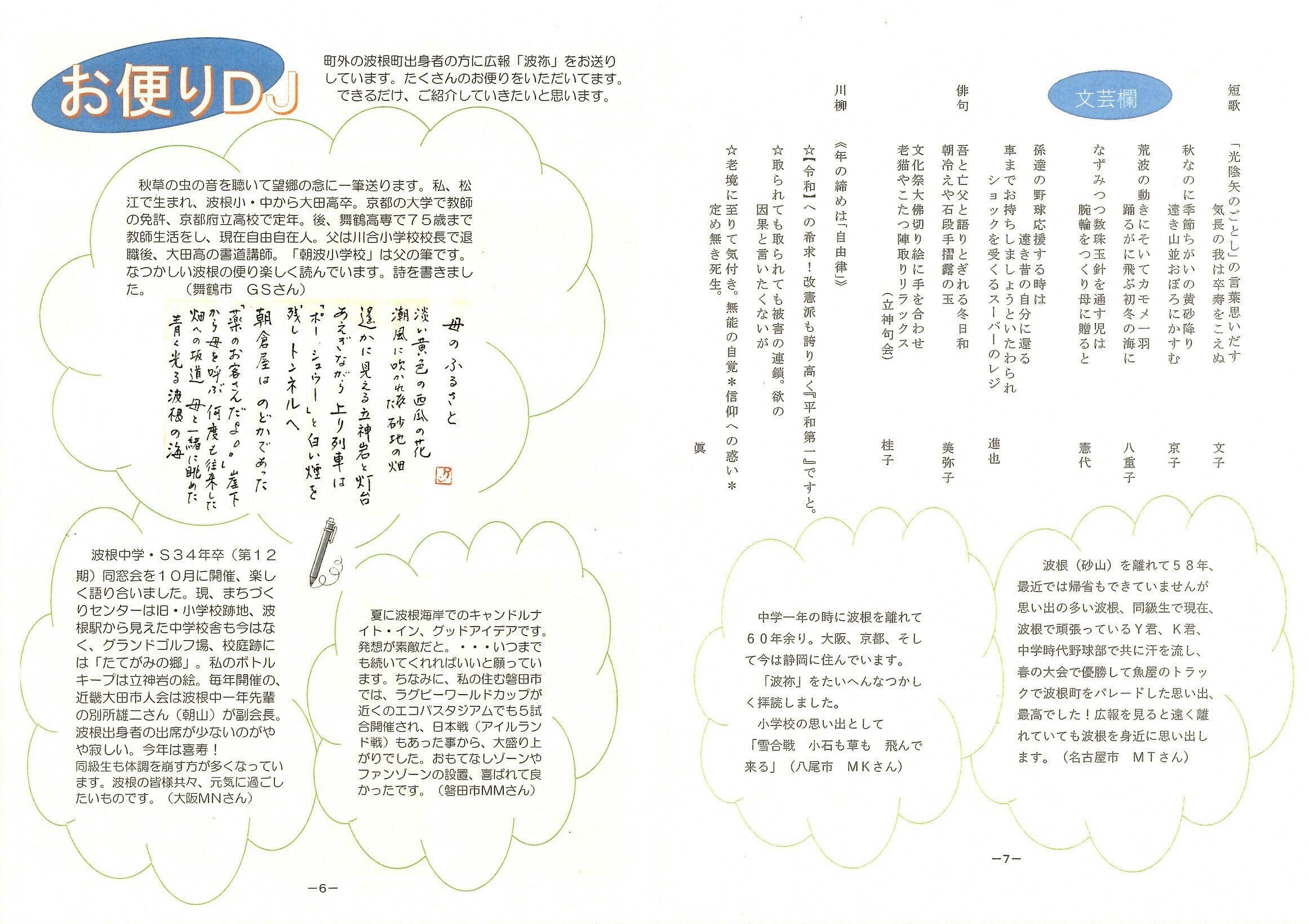 ▲「お便りDJ」コーナーは、出身者の方々からのお便りで大盛り上がりです。 2年前の4月9日未明、島根県大田市波根町は震度5強の予期せぬ地震に見舞われましたー島根県西部地震です。市内でも被害の大きい地域だったのですが、町全体を震撼させたその傷跡がまだ癒えないにもかかわらず、前向きに明るく暮らす元気な町の人たちの姿がありました。そんな「ふるさとの今」を今は地域を離れて暮らす出身者に届けてみたらどうだろうと思いたち、震災から1年を経過した昨年2月から、同窓会名簿を頼りに広報紙「波祢(はね)」を送り始めました。すると、それが思わぬ反響を呼んで波根を懐かしむ声やがんばれとエールを送るお便りが編集部にたくさん届くようになりました。その声を広報紙の「お便りDJ」コーナーで紹介しています。波根町民も出身者の方を懐かしく思い、声をかけるきっかけにもなっていて、今では100名近い方々との広報紙による「文通」が続いています。
