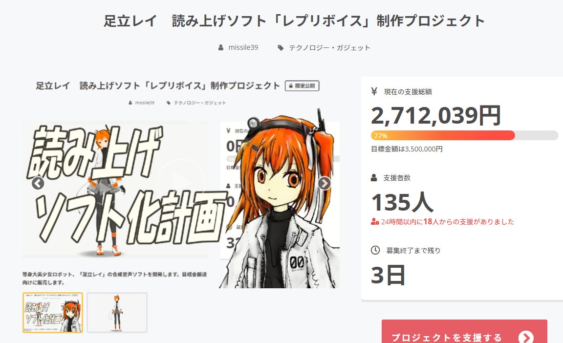 おはようございます!昨晩クラウドファンディング最終日でしたが、最終的に454万7039円を集め、第2ゴールの感情スタイル「喜」追加まで達成して終了しました!°˖☆◝(⁰▿⁰)◜☆˖°本当は一昨日の21時半頃、350万円を突破してプロジェクトが成立した時にも記事を上げたかったのですが、怒涛の更新とTwitterでの宣伝集中などで余裕がなく、そのまま最終日まで走り抜けました。最後は終了のわずか25分ほど前に第2ゴールの450万円、感情スタイル「喜」を達成して終了。まだドキドキしています。また、たくさんのリターンの支援に加え、支援絵や支援動画など、とても助かりました。精神的にもとても助けられました。本当にありがとうございました!まずこれから法人登記(起業)を行います。実はもう書類などはほとんど用意してあるので、法務局に書類を持って行って10万円くらい払えば法人設立できます。10万円の額から分かるかもしれませんが、会社形態は合同会社を予定しています。この辺りについても、進み次第活動報告やTwitter等で報告していこうと思いますので、よかったらチェックしてください!また、レプリボイス足立レイの開発に関する自分の仕事としては、音声提供(作成)者として、足立レイの音素バランス文の読み上げ音声を100~150文分作る、という作業があります。その際、今までの知見を活かしたり、先日発見したさらに声を良くすることができそうな方法等をエーアイさんと協力して試し、より良いライブラリ化用音声を作るという事に全力を傾ける必要があります。がんばります!↑のソフト良さそうだったので早速購入予定です。RX-8。5万円近くするソフトなのですが学割で買えたので25000円くらいで買えそう。学生万歳(∩´∀`)∩これはプロジェクト運営者が見れる支援金額の推移グラフなのですが、見ての通り最後の2日だけで約150万円集めています。それも実際には3月28日の18時頃までは300万円程だったので、それから僅か3時間半ほどの間に50万円集めて350万円達成、何とかなったと喜んでいたら何とそのままの勢いで昨晩ギリギリ450万円を達成した、という感じです。3月28日の午後、普通日中は伸びないと分かっているとは言え、50万円を残し、残り1日と半分もない中全く伸びずに半日ほど過ぎるのはだいぶ怖かったですが、達成して本当に安心しました。一般的にクラウドファンディングのグラフは開始数日と終了前数日が最も伸び、中間期間では伸びないそうですが、大まかにはそれに沿っています。ただ本当に最後に集中したなという感じです。運営者としては生きた心地がしませんでしたが(ノ∀`)しかし終わりよければすべてよし!です!(`・ω・´)早速振り込み申請してきました。これで4月末に振り込まれ、スケジュール的に最速で動けるはずです!漏れがだいぶあるとは思うのですが、最後にここに支援絵やツイートなどのリンクを時系列順にまとめておきます!20日間、支援、応援本当にありがとうござました!!-------------------------------------------------------------------------------3/8シン・エヴァンゲリオン公開3/9ミクの日足立レイ レプリボイスプロジェクト発表。同時にクラウドファンディング開始SpyNEWS@合成音声関係のニュース @SpeechSynthnews合成音を元にしたA.I.VOICE音源「レプリボイス 足立レイ」制作のクラウドファンディングが開始された3/10支援記事 ごぼうP中の人がいない!?足立レイのA.I.VOICE計画が始動!!ボイスフュージョンできるかどうか話題にhttps://twitter.com/missile_39/status/1369449178116616195足の動作試験でちょっと宣伝https://twitter.com/missile_39/status/13695694057393111103/11エーアイさんによる告知https://twitter.com/AIVOICE_PR/status/1369855662096674818右脚(ロボット)が立ったのでちょっと目立つ。ついでに宣伝https://twitter.com/missile_39/status/1369956899962064898エヴァのテーマソング全部レイで歌ったのが少しRTされたhttps://twitter.com/missile_39/status/13700248558405918743/12小春六花発売開始低額リターン追加クラファンページ本文にもA.I.VOICEと同一エディタで使える旨記載海外でも紹介されたっぽいCrowdfunding for Adachi Rei’s A.I.VOICE is openCrowdfunding for A.I.VOICE Adachi Rei, TTS without a voice provider3/13ニコニコ大百科に足立レイの記事ができるhttps://dic.nicovideo.jp/a/%E8%B6%B3%E7%AB%8B%E3%83%AC%E3%82%A4支援動画 Haru.jpg@Haru_jpg3/14pixivにも足立レイの記事ができるhttps://dic.pixiv.net/a/%E8%B6%B3%E7%AB%8B%E3%83%AC%E3%82%A4支援動画 kadotanimitsuru@kadotanimitsuru【足立レイ】ビートシンカー【UTAUカバー】カゼミツ @kazemitsu紹介記事 週刊ボカフロ人型ロボット「足立レイ」の読み上げソフトを制作するクラウドファンディングが開始。人工的に合成した音声を元にした"中の人"がいない合成音声ソフトを、A.I.VOICEのエンジンを使って制作する計画3/15脚部実験で少しだけバズ&宣伝https://twitter.com/missile_39/status/1371128680638935043支援動画 てきとう@kotonohagalaxy3/18レプリボイスプロジェクト第一回公式生放送。株式会社エーアイから研究員のTさんをゲストに。3/19A.I.VOICE結月ゆかり、紲星あかり発売時期な