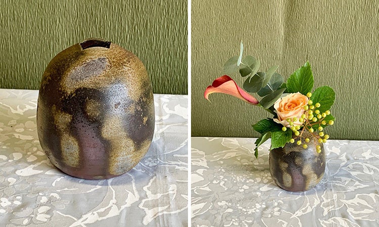 この花器は、手桶風の形で、女性に人気の作品となっております。特に、花を活けていると買われる方が多いです。