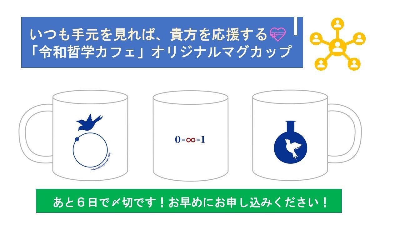 皆様の応援のおかげで本日100%達成しました!!ご支援いただき誠にありがとうございます。昨日令和哲学カフェで公示させて頂いたマグカップ案も沢山の投票やコメントをいただき、大変参考になりました。昨夜マグカップが一気にSOLD OUTになり、製作チーム一同感激しておりました!!! お問い合わせも多数いただき30個追加予定となっております。デザインも最終決定いたしましたので、画像でご確認ください^^令和哲学といえば!!『ビン鳥』ということで、ビンの中の鳥と、外に出た鳥を表現していますが、皆さまの『解析次第』ではどのようにも活用できるオリジナルの作品となっております。スタッフも完成が待ちどおしくてワクワクしています!そして残り9日NEXT GOAL(第2目標)である125%を目指します125%達成した際には、なんと!!!5000円以上支援いただいてる皆さまへ令和くんのイラストステッカーを追加でプレゼントさせて頂きます♡こちらもイラストにビン鳥が描かれているとっても可愛いステッカーとなる予定ですプロジェクト発足時の想いは『令和哲学フェを1000人集まるオンラインカフェにしていたい』初心を忘れず、これからも歴史に名を残す挑戦を続けていきたいと思っていますラストスパート一緒に盛り上がっていきましょう!!