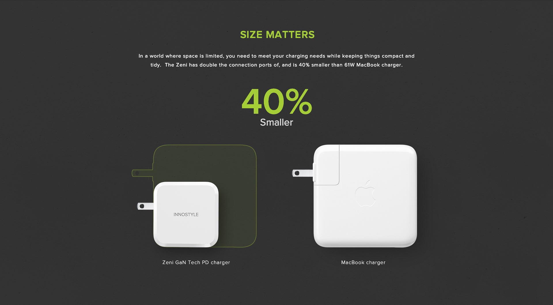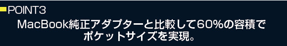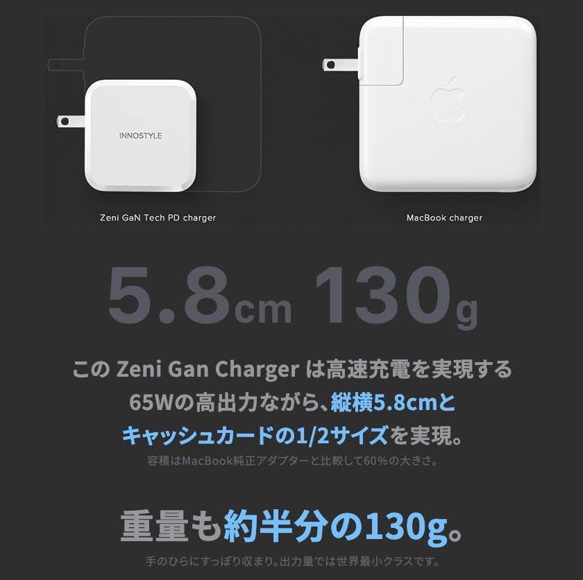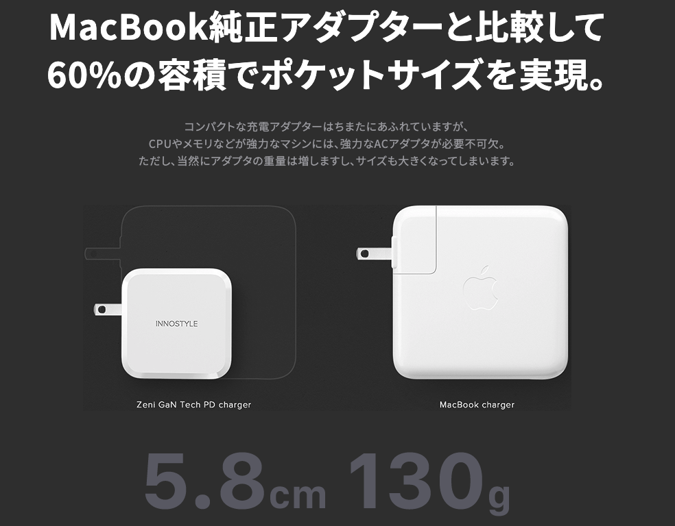 macbook proのチャージャーの約60%のサイズを実現。しかも重量の約半分の130g。