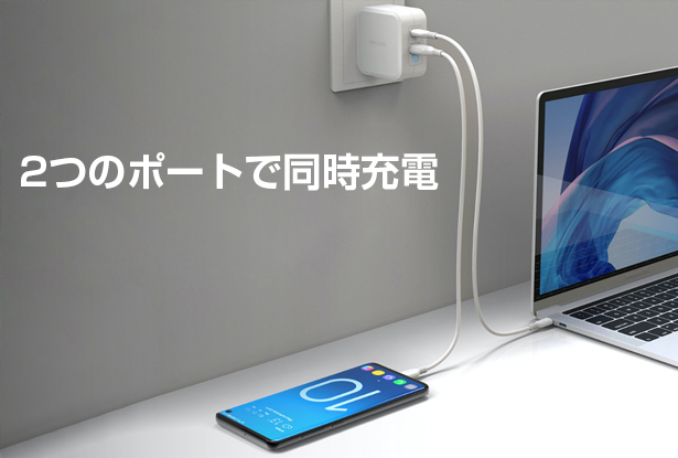 出力ポートを備えているので、スマホとノートパソコンなど2つの異なるデバイスを