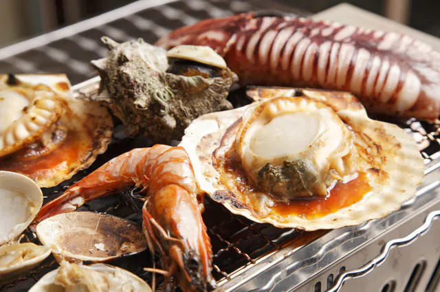 ①石川県の海で獲れた牡蠣・ホタテ・大あさり・イカ・エビなどの浜焼き