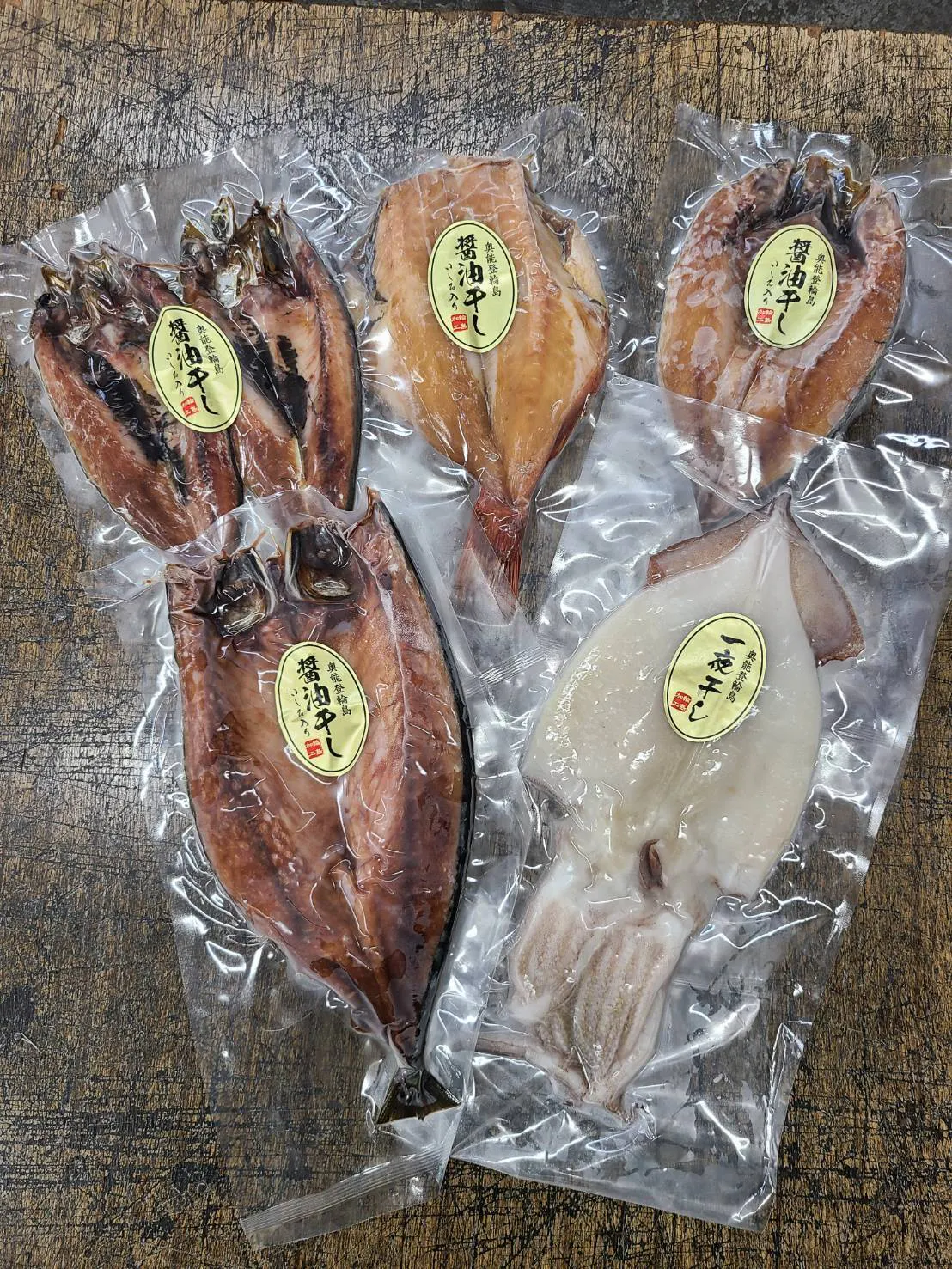 内容はあじ・さば・いわし・赤魚の醤油干し(能登の魚醤”いしる”使用)、スルメイカの一夜干しとなります。