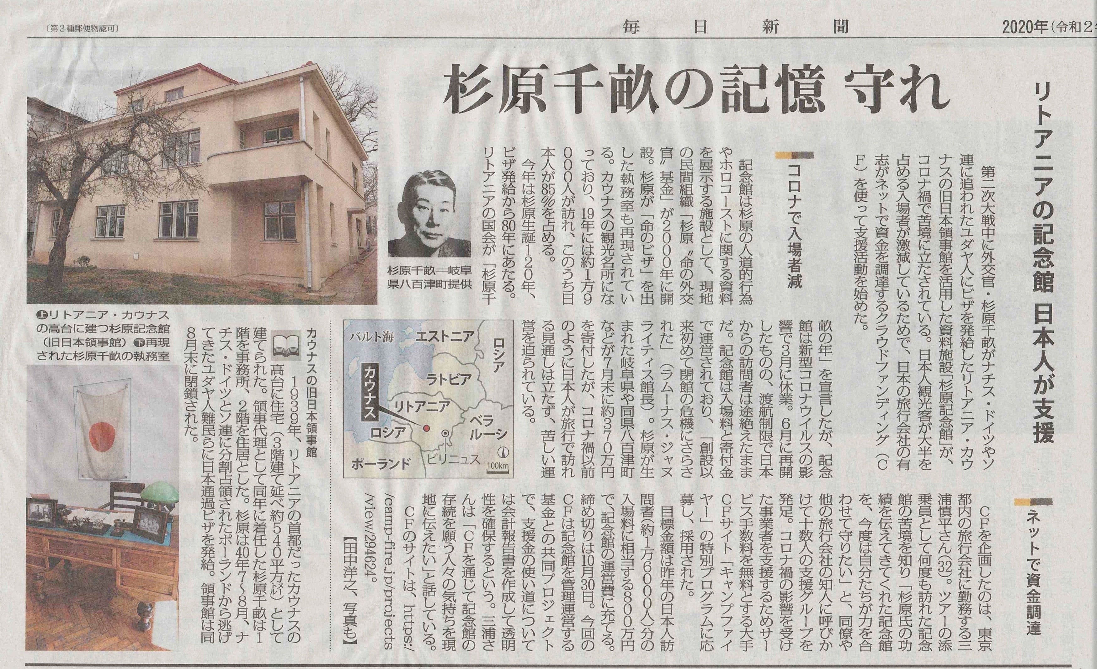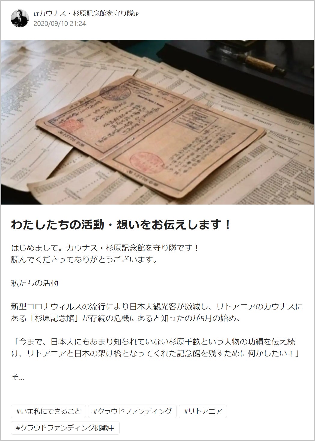 皆様、この度はカウナス・杉原記念館存続に向けたクラウドファンディングにご支援頂きまして誠にありがとうございます。先日の活動報告でもご報告させて頂きましたが、皆様のおかげで目標金額である800万を達成致しました!ご支援、ご賛同下さった皆様には改めて心より感謝を申し上げます。このクラウドファンディングも残り5日となりました。報道等でもご存知かと思いますが、ヨーロッパでは新型コロナウイルスの新規感染者が増え、再び外出禁止令を発令した国も出ています。杉原記念館があるリトアニアも同様に感染者が増えており、7月上旬には新規感染者が1名という日もありましたが、昨日の新規感染者は過去最多の474名となってしまいました…市中感染が広がっている証拠である感染経路不明者も増加しているようです。是非、杉原記念館が1日でも長く存続出来るよう、最後に力を貸して頂ければ幸いです!杉原記念館のスタッフは希望を捨てず、辛い状況を切り抜けて後世に残す為に杉原記念館が存続出来ることを強く信じています!クラウドファンディングのページ内に書けなかった私たちメンバーの想いを綴ったnoteも更新しています!第五弾は杉原千畝さんと縁があるメンバーが登場しています。どんな縁があるのでしょうか?ぜひご覧ください!https://note.com/savesugihara/n/ne65f1f4c8d6a私たちもまだ5日ありますので、最後まで誠心誠意活動してまいります!もし身近にご賛同頂ける方がいらっしゃいましたら、このクラウドファンディングをお伝え頂けると嬉しいです。