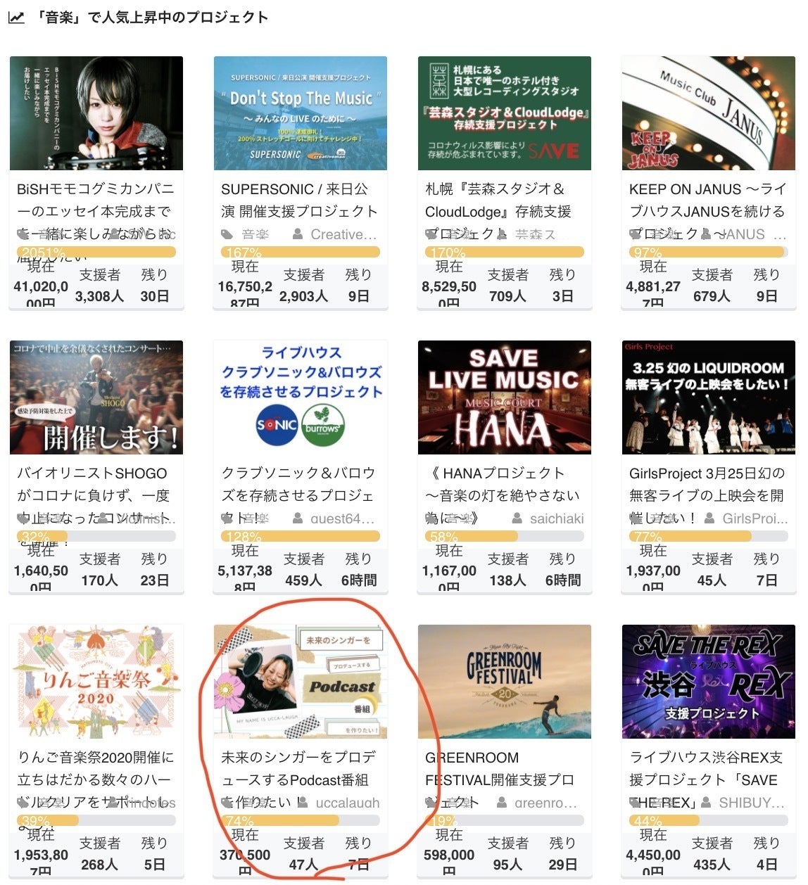こんばんは!7月22日(水) みなさん、いかがお過ごしですかー?クラファンのプロジェクト【未来のシンガーをプロデュースするPodcast番組を作りたい】今日は2名にサポートいただきました。ありがとうございます!残り¥126,500です!あと7日!そわそわしてきました〜w今日初めてこのプロジェクトを知り、このページへ辿り着いた方へ。詳細はコチラをご覧ください。毎日、CAMPFIREのページを見てるわけですけれども、ふと音楽部門をのぞいたら人気上昇中トップ10位にランクインしていました!(Top画像)確か、ここに表示されているということは、ページ閲覧数が関係していると聞いたことがあります。残り少しだけど、ここのトップ3に入れたら、より多くの人にこのプロジェクトを見ていただける機会が増えるということです。この連休、もしお時間ありましたら、SNSで是非シェアお願いします。リターンも追加したので、良かったら見てください。詳細は明日書きます!引き続き、サポートどうぞよろしくお願いします!Ucca-Laugh SNSInstagramtwitterUccatubeSpotify