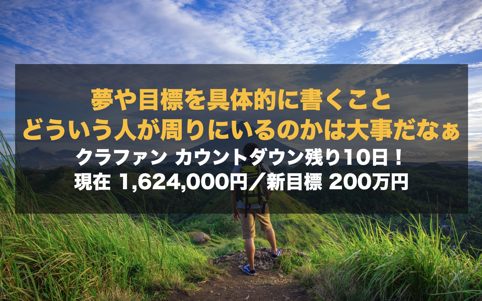 クラファン カウントダウン残り6日!現在 1,971,650円/新目標 200万円(残り28,350円)クロスロードのタクです。いよいよ、クラファンも残り6日となり大詰めとなりました。引き続き多くの方にご支援、SNSでも多くのシェアをしていただいています。本当にありがとうございます。本日は今のSNSの世の中で大切だなぁと最近感じていることについて書いてみたいと思います。「積み重ね、形にし、伝える術」を持つことの大切さ僕の友人の中には、SNSやお仕事で大成功をされている人がいて、先日その方と話をしている時に気がついたことがあります。そしてそれこそが、現代における一つの成功の方程式なんだろうなー、と感じました。それは「積み重ね、形にし、伝える術を持つこと」をすごく大切にされているということです。積み重ねること仕事にせよ、勉強にせよ、スポーツにせよ、積み重ねることでその人が持つスキル・知恵・技は素晴らしいものになります。そしてそれだけではなく、その積み重ねたという事実自体が重みになり、信用につながっているのだと思います。僕らが歴史を積み重ねてきた個人や企業に対して抱く畏怖の念は彼らのアウトプットに対するものだけではなく、信頼からも得られるんだと思います。でも個人レベルの話で言うと、積み重ねた数年〜10年程度でもすごいことだと思います。例えば、僕の友人で英語を扱うことが上手なけんちゃんやおすぎさんには、学習を続けてきた結果としての英語力がありますし、友人の大輔さんには、これまで路上書道で4万人の人に作品を提供してきた積み重ねがあります。これって本当に凄いこと!そうやって積み重ねることでしか、本当のスキル、知恵、技は備わらないし、そこから生まれる重みや信頼は生まれないと思います。形にすることこのSNS時代に大事なことの一つは「形」にすること。文章でも、作品でも、映像でも、音楽でも構わないと思いますが、形にすることは本当に大切です。なぜなら、僕らが誰かにその人の凄さや素晴らしさを伝えるためには、シェアをしないといけないのですが、「形」があるとそれが気楽に簡単にできるからです。どんなに積み重ねたことによる素晴らしいスキルを持っていたとしても、それを「映像」「文章」「音楽」などの「形」にしていないとそれを上手に伝えることはできません。そこが上手な人と下手な人では、このSNSの世界では大きな差がついてしまうなぁと感じます。例えば、僕は会計士でもあるのですが、元同僚で圧倒的な会計税務の知識量を持つ人がいます。凄まじい勉強と日々の研鑽の積み重ねによって得た知識や能力なのですが、それを何か「目に見える形」にしてきたわけではありません。もちろん、周りの人は彼の能力を理解しているのですが、それをもう少し大勢の人に伝える形あるものを作ってきたとしたら、きっと大きな力を得られるのだろうな、と思います。むしろ、知識や知恵はそれほどでもなくても、文章や映像などの「形」を整えて一般の人に伝えることに長けた人のほうが、今の世の中では成功や称賛を得ることになるのかもしれませんね。伝える術を持つこと「積み重ねたもの」を「形にして」も「伝える術」がないとその素晴らしい何かを誰も知ることはできません。「伝える術を持つ」ということで初めて、多くの人にあなたの存在や知識や知恵や作品を伝えることができます。「伝える術」を持つということは、世界の人々に大きな自分だけのスピーカーを持つことなんでしょうね。最近、SNS上に多くのフォローワーを持つインフルエンサーがもてはやされていますが、きっとその大きなスピーカーを持つことの重要性を反映しているのだと思います。「積み重ねたもの」や「形にしたもの」がないと、中身のない言葉や情報を垂れ流すことになってしまうかもしれませんが、「伝える術」を持つことの重要性はこれからもっともっと大きくなっていくのだろうなぁと思います。「積み重ね、形にし、伝える術」を持ちたいと強く思いました。考えてみると、今回のクラウドファンディングもこの「積み重ね、形にし、伝える術」を持つことが試される場面だったのだと思います。クロスロードには7年半の歴史しかありません。でも、たかが7年されど7年。これまで多くの人々に関わっていただき、そこで積み上げたものはいくらかあったのだと思います。関わってくれた方には本当に感謝したいです。そして、こちらも多くの方に関わってもらい、多くのコンテンツという形が残っていたのも、とても助かりました。KEI君が作ってくれた動画やシミちゃんが描いてくれた漫画もその一つです。伝えることって本当に大事だな、と感じました。まだまだ弱いながらも、TwitterやFacebookなどの伝える術も大切だと本当に実感しました。伝える術がないと、たとえどんなに素晴らしいものを積み重ね、それを形にしたとしても誰の目にも止まらないということになりかねないから