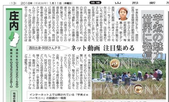 2018/02/21 21:40ご無沙汰しております。「芋煮 de ハーモニー」Music Videoの公開後、3ヶ月が経ちましての活動報告です。 冒頭の画像は、2018年1月11日の山形新聞に掲載された記事です。ありがとうございます! ヤマガタ未来ラボさんにも記事掲載していただきました。https://mirailab.info/column/17532 昨年都内で開催された芋煮会や、酒田で2017年12月30日に開催された「白ばら」の再グランドオープンセレモニーでも、ご来場者の皆さんと芋煮ダンスを踊りました。 ▼2017/11/26 『TOHOKU LOVERS FES 2017 ~山形~』@北千住「東北うまいもの酒場 プエドバル」インターネット放送局Cwaveの番組「東北わくわく放送局」に生出演させていただきまして、「芋煮 de ハーモニー」MVを紹介しつつ、芋煮ダンスを皆さんと踊りました。(46:16~) そして、交流会の締めで踊った「芋煮 de ハーモニー」芋煮ダンス動画。https://www.facebook.com/ayateck/posts/10208006075548500?pnref=story ▼2017/12/19 庄内風芋煮の芋煮会@田園調布 スジェールコーヒー芋煮会終了後、有志の皆さんで芋煮ダンスを踊りました。酒田出身・佐藤寛己くん撮影の動画です。https://www.facebook.com/events/1970603489880692/permalink/1979423698998671/ この「芋煮ダンス」の力、みんなで踊ることで場に生まれるあったかい一体感、すごいなと思います。 また、3/10、3/11に都内を中心に全国各地拠点で開催される「おうえんフェス」の中で、世のため人のために応援(活動)している人「おうえん王」の候補たちによるWEBトーナメント「全国おうえん王決定戦」が開催中です。ここで勝ち上がった3名が、3/10のおうえんフェス決勝戦(文京シビックホール)に進出し、キングコング西野さんがゲスト出演するイベントに登壇できます。 こちらに、僭越ながら、私・阿部彩人が山形代表として推薦されエントリーさせていただいております。トーナメント1回戦の投票は、2/22(木)22:00まで。私は「Group 応」で、神奈川代表の原さん、佐賀代表の斎藤さんと対戦しておりまして、21日18時現在で、佐賀代表の齋藤さんが53票、私が57票と非常に接戦となっております! 以下ページの「投票する」ボタンから1日に1回投票できますので、ぜひご投票をお願いいたします!▼「おうえん王決定戦」詳細・投票はこちら。https://peraichi.com/landing_pages/view/ouenoutouhyou 私は、この「芋煮 de ハーモニー」&芋煮ダンスで、より多くの人たちが芋煮に触れるきっかけを作り、芋煮会に参加する人を少しでも増やすことで、地域と地域の垣根を越えて、人と人がもっとつながっていけばいいなと思っています。 トーナメントを勝ち上がって最終決戦に進むことができたら、会場の文京シビックホールで、芋煮を全力でPRするとともに、ご来場の皆さんと一緒に、ぜひ芋煮ダンスを踊りたいと考えております!ぜひ、皆さまのご投票をお願いいたします! もっと見る
