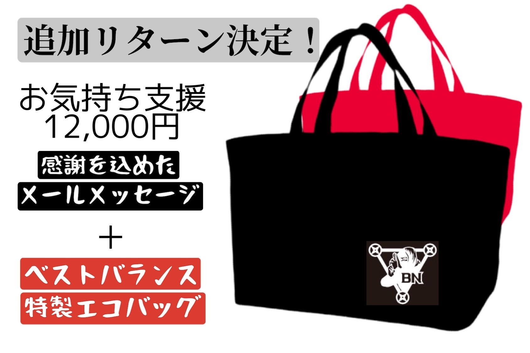 また、700%達成を記念して、お気持ち支援を除く6,000円以上のリターンをご支援くださった方全員に「エコバックの黒を1点」をもれなくプレゼントさせて頂きます。