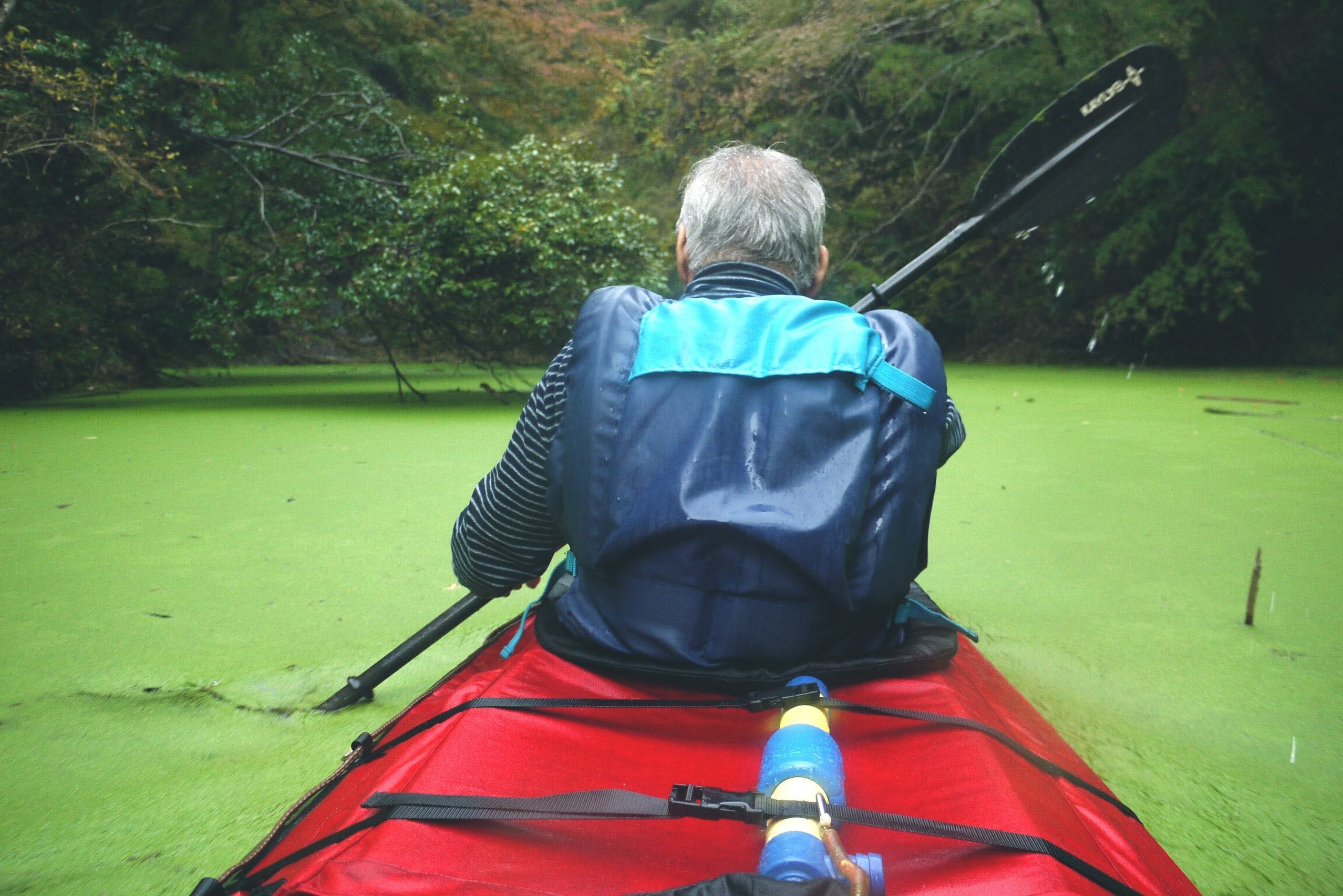 うちのおじいちゃんはカヤック大好き人間で、藻だらけの川だってグングン漕ぎ進めちゃう。