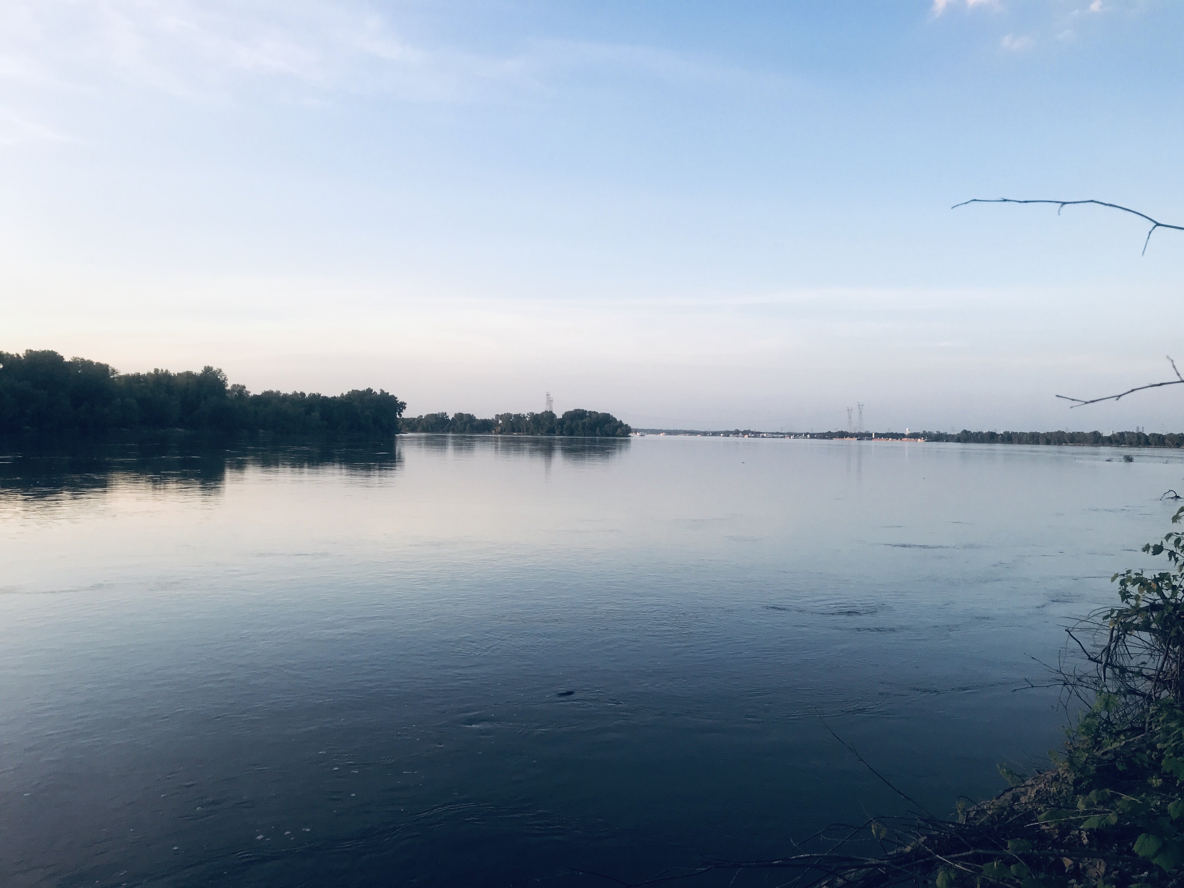 無人島からの景色。手前の川はこれから約1600キロ下るミシシッピ川。中央にある緑の間が、3週間1200キロ漕いできたミズーリ川の終わり。
