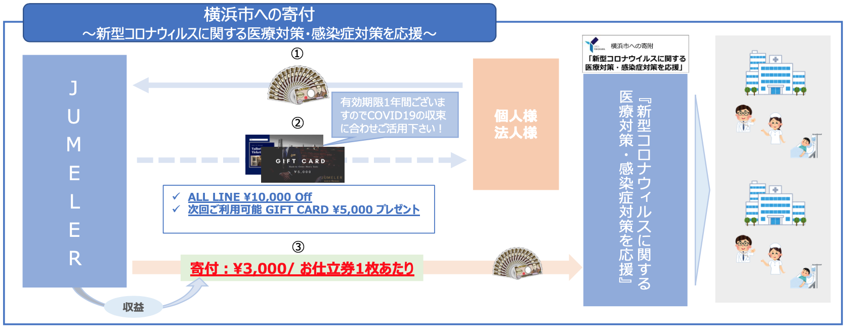 弊社のオーダースーツをご購入頂いた(個人様・法人様)販売収益を(3000円/1着)横浜市が新設した『新型コロナウィルスに関する医療対策・感染症対策を応援』という窓口に寄付をさせて頂く取り組みです。