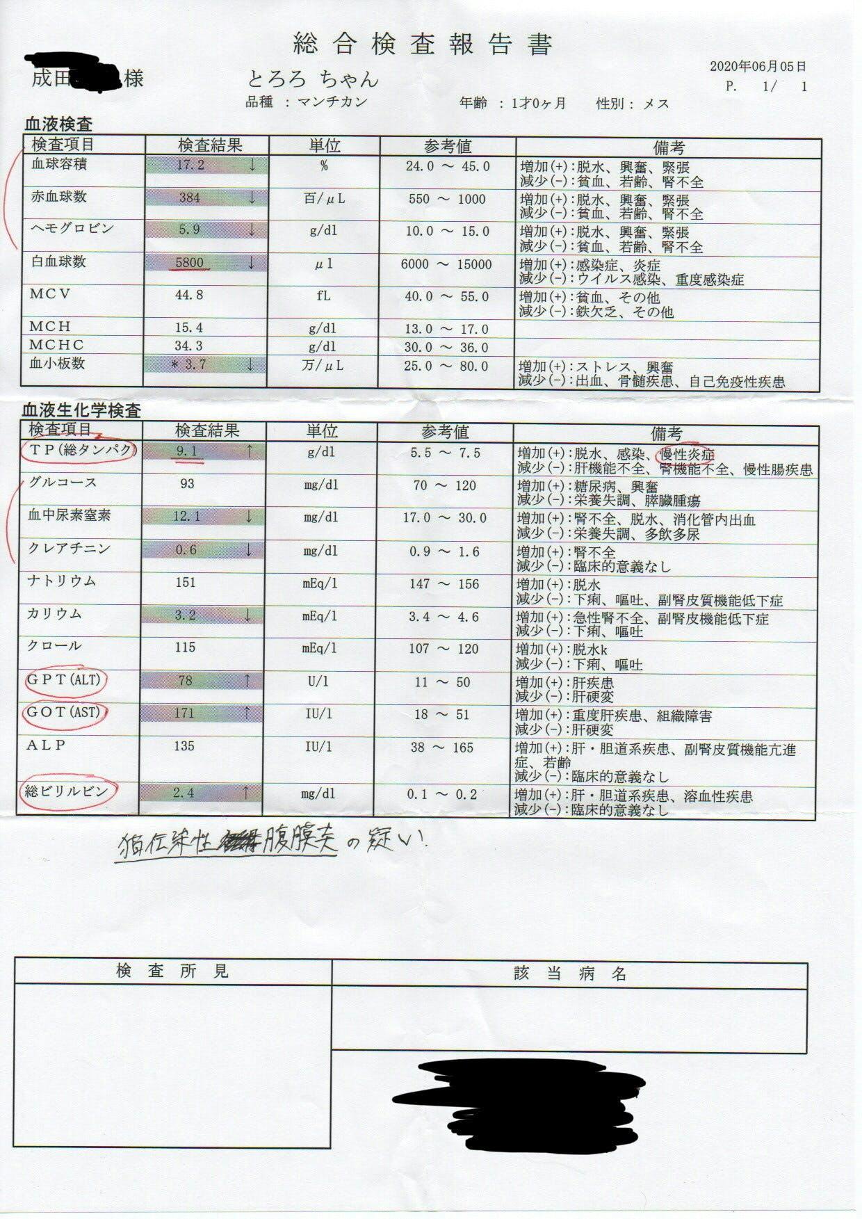 万が一のことを考えて血液検査も行った結果、貧血と肝臓の数値が高いことから、FIP(ウェットタイプ)の疑惑が出たため外部検査も行うことにしました。