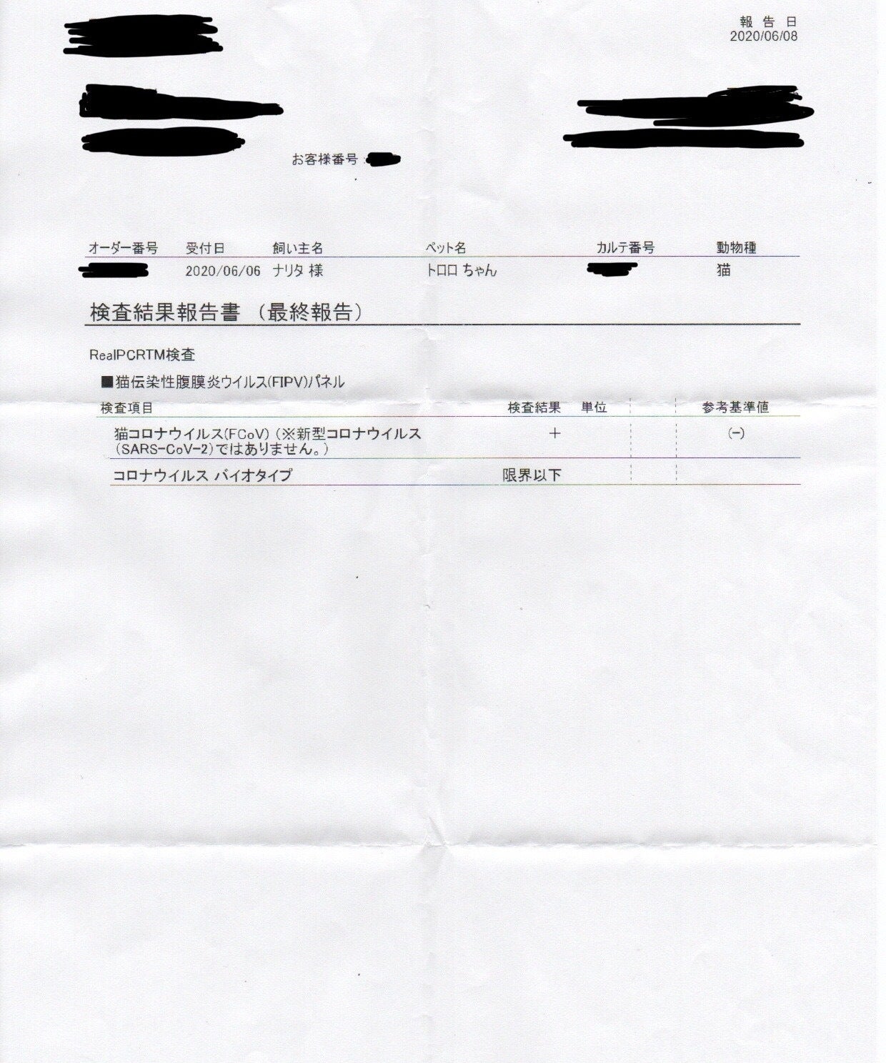 万が一のことを考えて血液検査も行った結果、貧血と肝臓の数値が高いことから、FIP(ウェットタイプ)の疑惑が出たため外部検査も行うことにしました。
