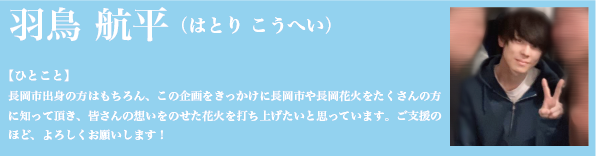 『学生の皆さんによる、感謝の想いを花火で伝えたいというこのプロジェクトを応援しています。本来、長岡花火には復興、平和への祈りの想いが込められており、コロナ禍で影響を受けた多くの方の心を明るく照らす花火が打ち上げられる事を願っております。』