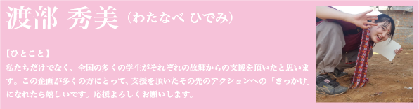 明治学院大学に在籍しております、渡部秀美です。大学では、比較政治学を専攻しています。サークルは国際ボランティアサークルに所属しており、カンボジア・ネパール・フィジーで家を建てる活動をしました。最近はK-popにはまっています!