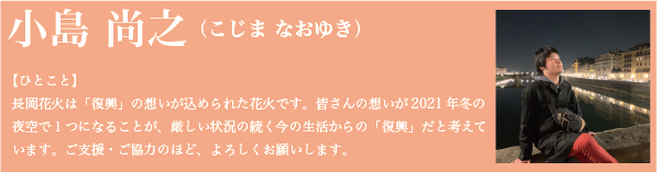 長岡に在住している方や、長岡市出身で今は市外で活動されている方、また、全国の花火ファンの皆様の想いが、2021年2月の夜空で1つになることを願っています。