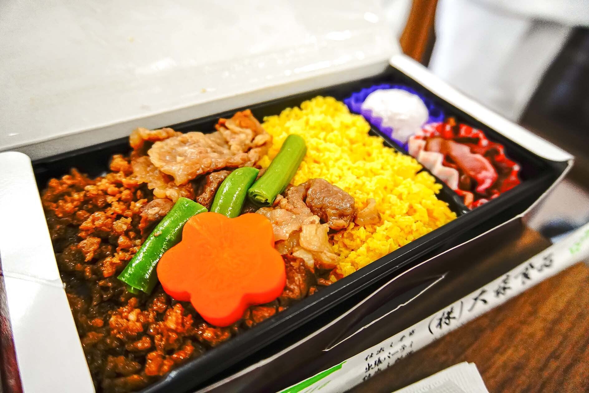 本日のお弁当は、株式会社大森食品さんの「黄門三味弁当」です。常陸牛のステーキ・ローズポーク・奥久慈鶏の玉子を使った、茨城を代表する三味を閉じ込めたお弁当です。