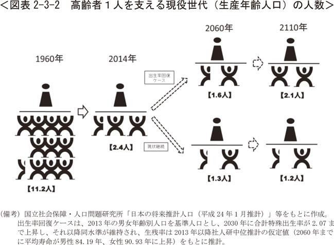 世代間の扶養関係を、高齢者1人に対して現役世代(生産年齢人口)が何人で支えているかということで考えると、高齢者1人を支える現役世代の人数は、1960年では11.2人でありましたが、少子高齢化により、1980年には7.4人、2014年では2.4人となりました。現状が継続した場合、2060年、2110年時点では高齢者1人に対して現役世代が約1人となる、「肩車社会」となります。