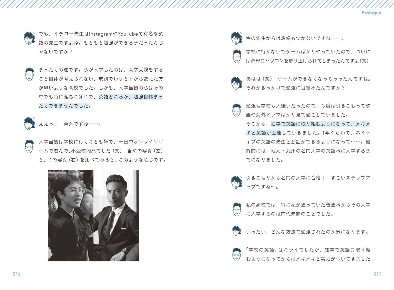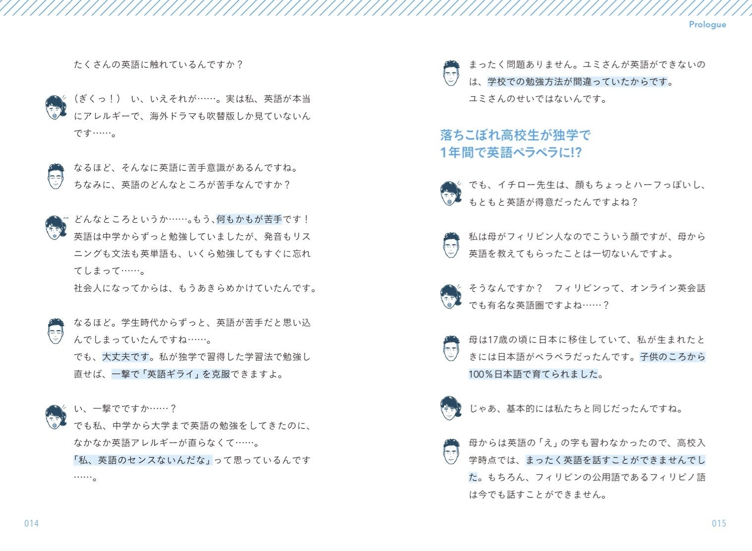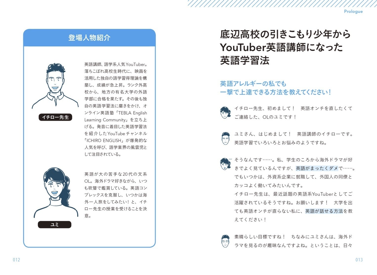 まず、本は縦書きではなく 横書きで、チャットの画面のような対話形式にしました。私と架空の生徒さんが、キャラクターの顔のアイコン付きで、交互に対話していきます。この対話では、実際にこれまで私が、英語学習に悩む相談者と会話していた時の会話の流れを忠実に再現しています。きっとあなたも初心者の英語学習者なら、今、この架空のキャラクターと同じような考え、状態のはず。まるで、あなたが私にマンツーマンの指導を受けているかのように錯覚しながらスラスラ楽しく読み進めていけると思います。