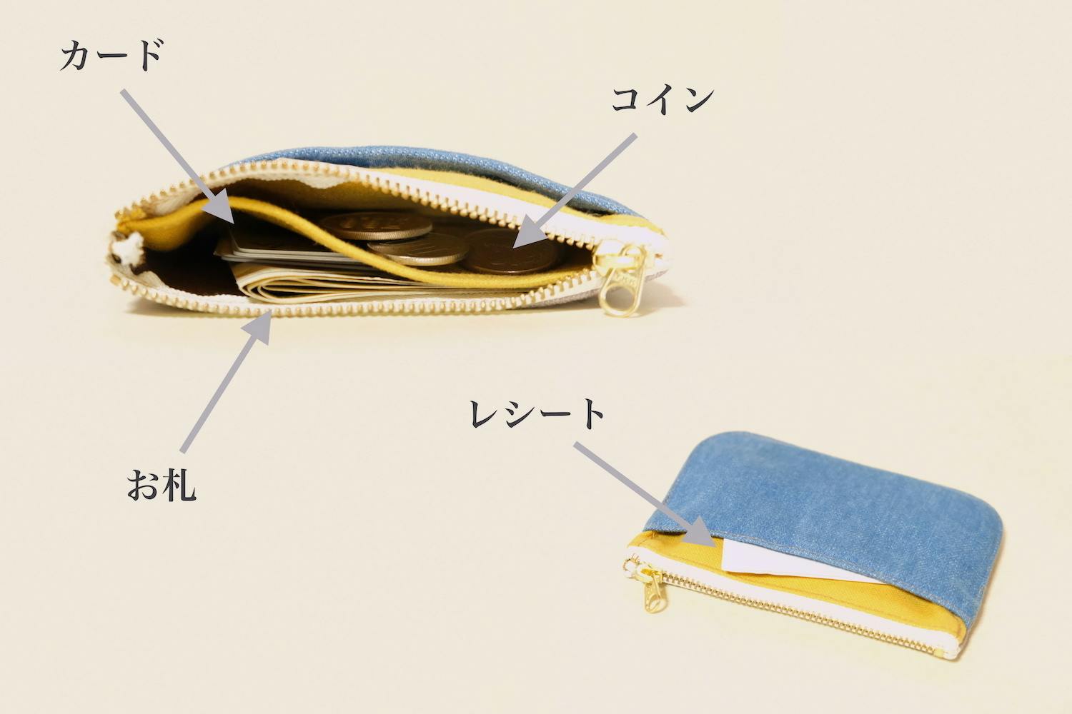 たとえば、お札10枚、小銭20枚、カード10枚を入れても、十分な余裕があります。小さいですが、普段使いのお財布として必要な機能はしっかりと。縁にステッチをいれて丈夫にしているので、たくさん入れてもカタチが崩れません。