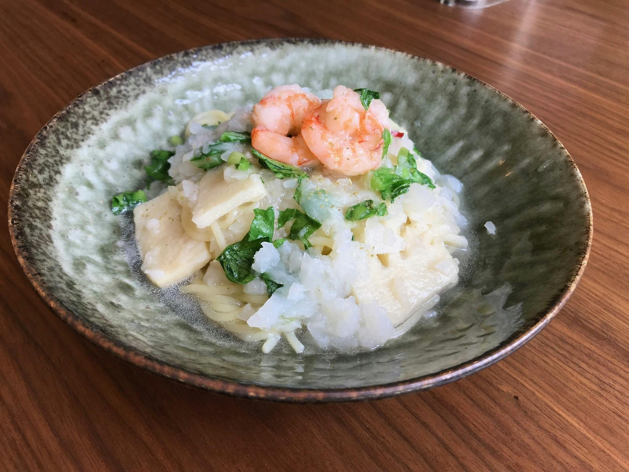 山本農園産春かぶらと焼き筍の和風お出汁スパゲティ 〜かぶら蒸しがヒントになった山盛りのかぶみぞれ餡、筍とエビが入って、最後に葉と茎をさっと合わせ、山椒を振る。カツオベースのお出汁でいただくなんとも滋味深い、体の中までしみわたる優しい味である。野菜が主役のパスタではこれが一番かな、、、と思えるぐらい今までのパスタの概念を覆している。でも、人気は『渡りがに』、、、正直、野菜は地味なのだ。一度スタッフがこんなことを言っていた。新潟は野菜が身近にあるから、あんまりめずらしくないし、渡りがにとかのほうがご馳走って感じなんですかね?と。。。。