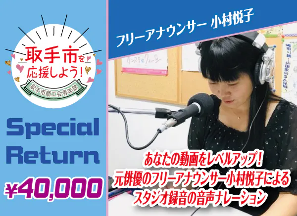 あなたの動画をレベルアップ!元俳優のフリーアナウンサー小村悦子によるスタジオ録音の音声ナレーションを付けて差し上げる券です!