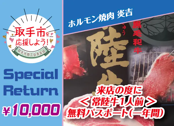 さて今回のリターンは、取手駅東口のこだわりのホルモン屋・炎吉さんのリターンのご紹介です。